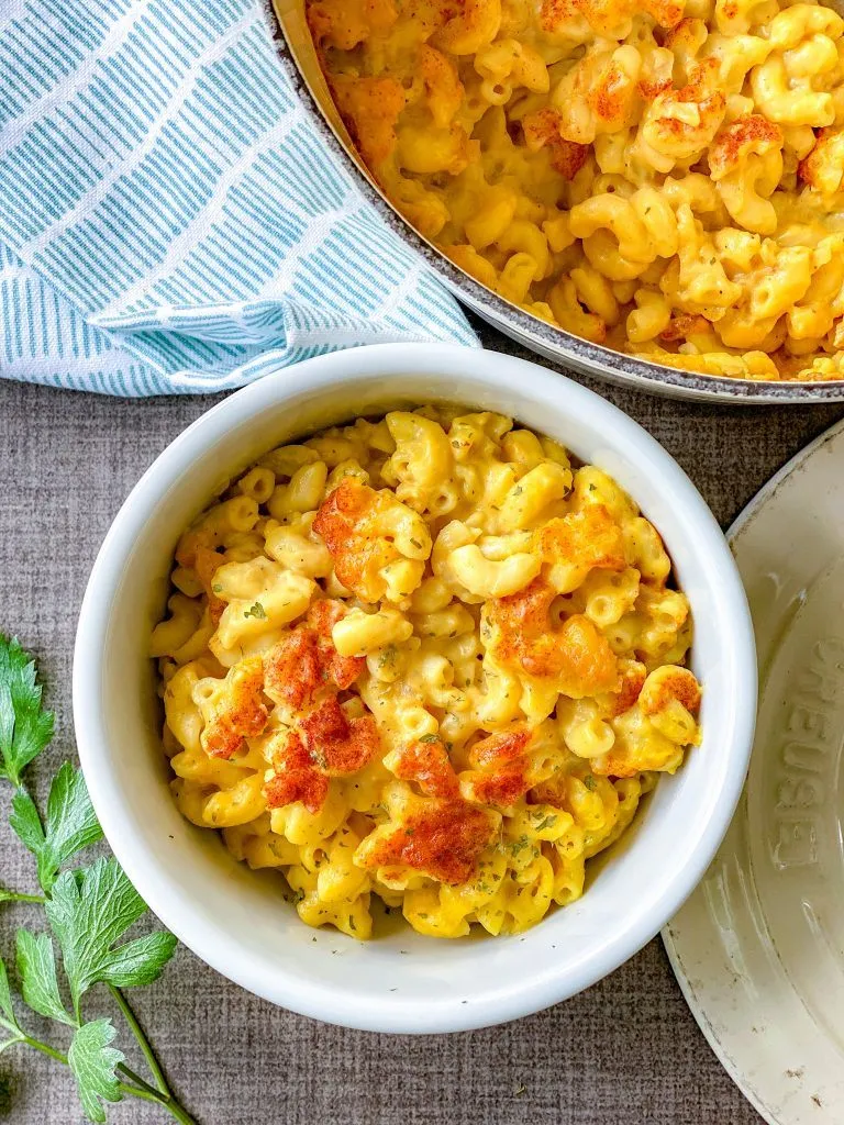 I’ve been vegan for over 30 years so I have a bit of experience with the vegan cheese evolution as well as the vegan mac and cheese promise to bring me back to my childhood. (Not usually successful). Most recipes require soaking cashews, which I am willing to do but not very good at planning for. And let’s be honest, cashew based cheese sauce doesn’t always do it. So I happily tried this one Sunday before our world locked down and I feel like I finally found the perfect vegan mac and cheese recipe, especially if you typically have some vegan cheese on hand. Yes, it takes more time than a boxed product but it is worth it. And no cashew soaking!