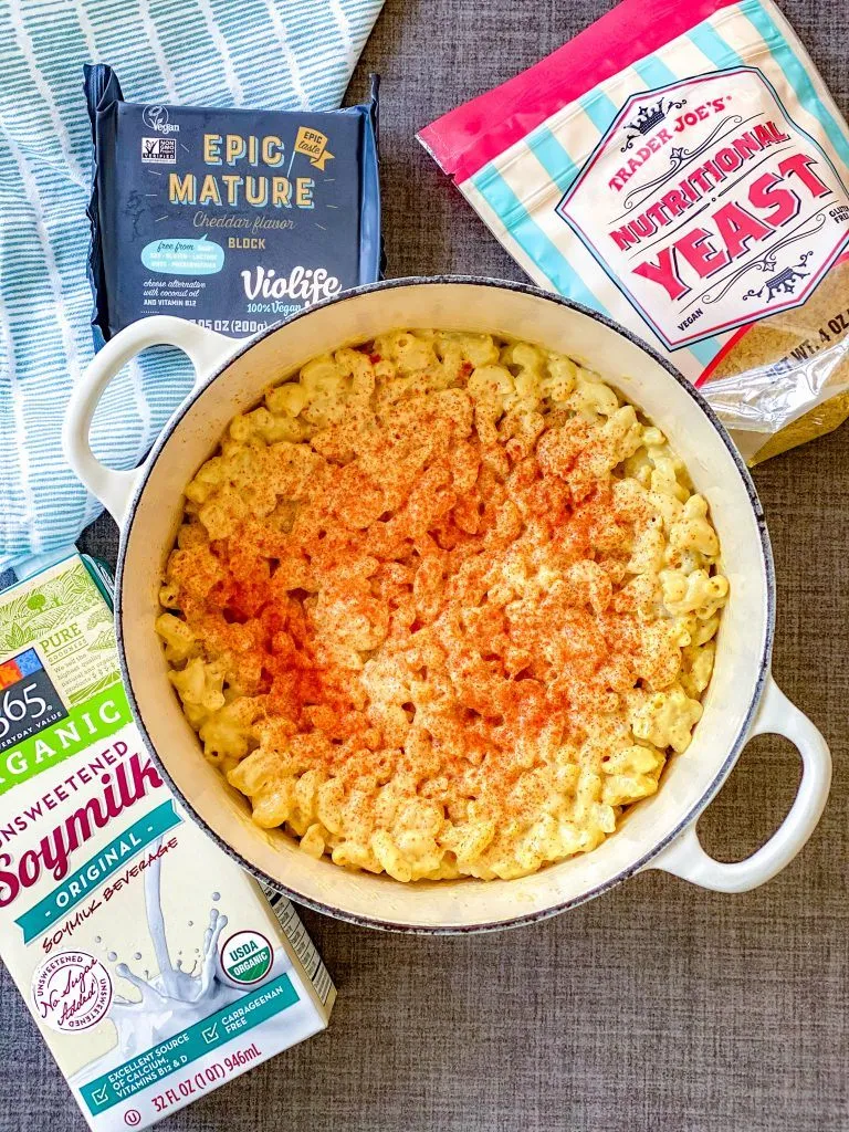 You’ll need elbow macaroni of course, but you could make this with shells or corkscrew pasta. I prefer the traditional shape, but do what you feel. Unsweetened milk is essential. I prefer soy, but you could use any alt milk provided it doesn’t have too strong of a flavor and is completely unsweetened. (Don’t ask me how I know what vanilla flavored mac and cheese tastes like.) For the vegan cheese, there are so many good ones out there that you could use one or a combo of your favorites, but make sure they’re “cheddar” style for that authentic taste. I used one pack of Violife cheddar and about half a pack of Daiya. Nooch or nutritional yeast is also a key ingredient and you can get it in bulk or Trader Joes has a well priced bagged one available.