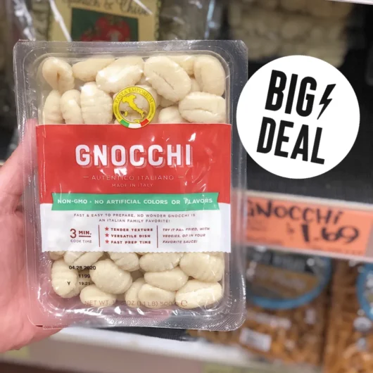 Who doesn’t love pillowy soft gnocchi? You know I love it, and after checking 4 stores all priced at $3.99 for the same sized package, Trader Joe’s came through again at only $1.69! This is especially good tossed with their kale basil pesto. Don’t gnocchi it til you’ve tried it.