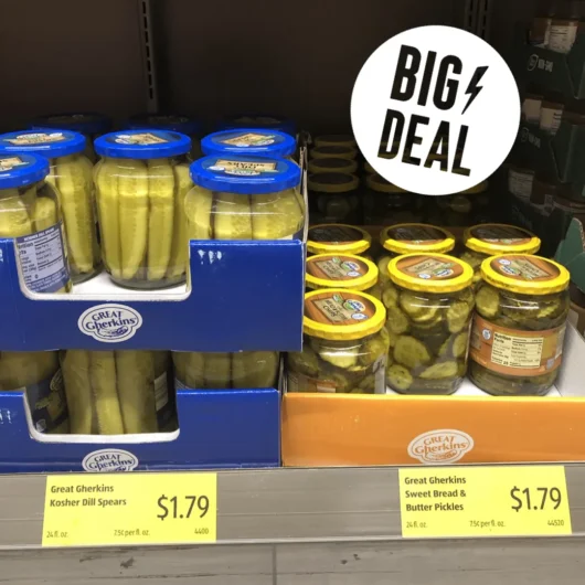Pickles can be expensive for just cucumbers and vinegar. Most “natural” store brands are upwards of $3.99, but not at ALDI! They’re $1.79 and are as tasty as they are value priced. I always stock up on 2 to 3 jars whenever I’m there as they keep forever. I don’t want to be caught in a pickle!