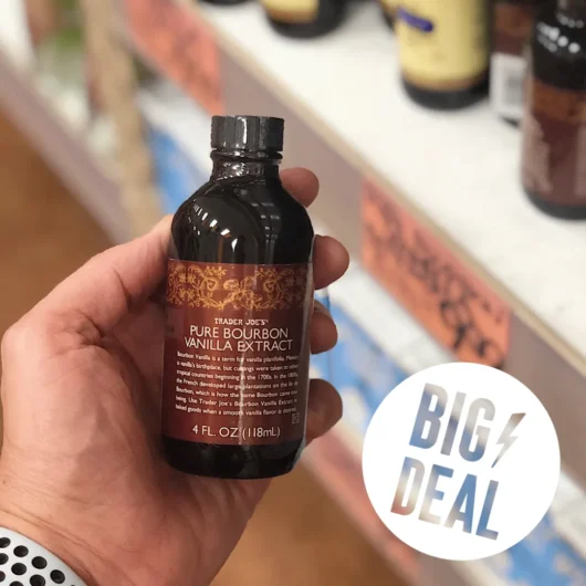 Real vanilla prices have skyrocketed in the last few years. I’ve read it’s due to orchid shortages. The dried pod containing vanilla beans is how pure vanilla is made. Can you buy cheap imitation vanilla? Sure, but it doesn’t compare. This is what Ina Garten refers to when she says “good” vanilla and Trader Joe’s has the best deal anywhere at $9.99 for a 4 oz bottle of pure bourbon vanilla extract. How bad can that be?