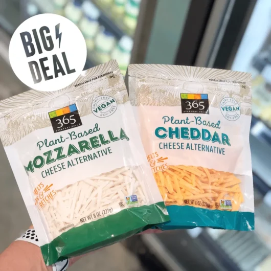 365 Everyday Value is Whole Foods Market’s private label brand and these new cheese shreds (and slices) are a great value at $3.99. Can you get a better price for vegan cheese on sale? Sure, but most vegan cheeses are at least $2 more per package. I’m pretty sure these are made by Violife for Whole Foods. They taste great, melt like a dream and are priced right.