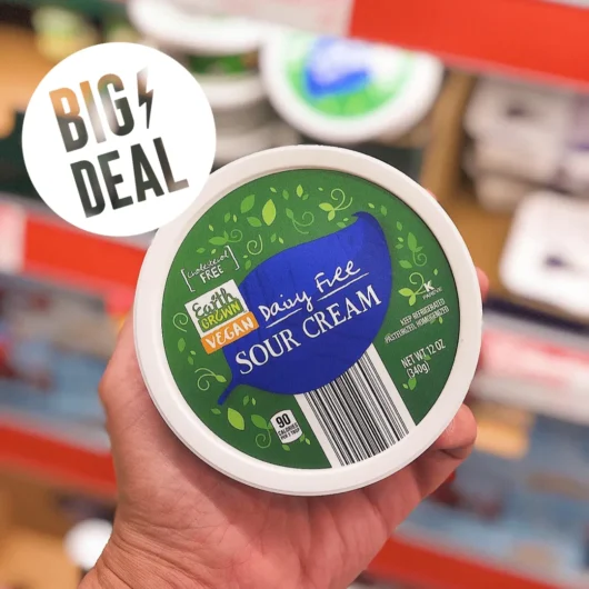 ALDI’s Earth Grown private label brand has a new vegan sour cream which I’m pretty sure is made by Tofutti as it tastes identical to it. It’s only $2.39 compared to $2.99 (at least) Tofutti brand sour cream found elsewhere. I’ve seen priced as high as $3.99 in some stores.