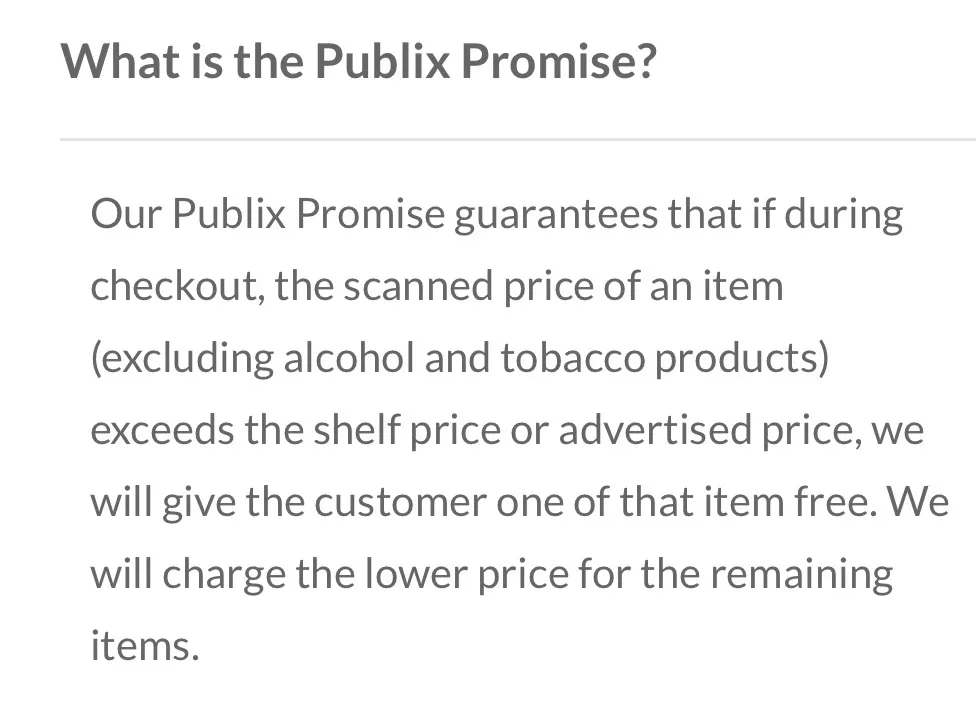 The Publix Promise. This is is similar to Whole Foods where they will give you the item free if it scans at the wrong price. I sometimes take a pic of the sign or tag if I feel the price is weird or the sign has the wrong sale dates to show customer service.