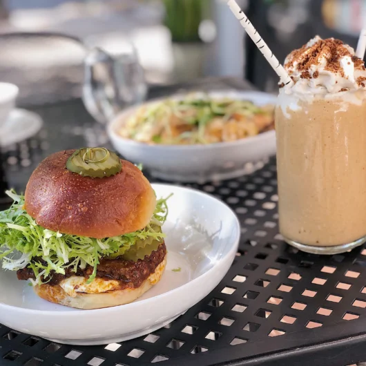 It was a perfect day and we got there right around lunch time but there was no wait for a table outside overlooking a beautiful tree lined square. Again, I looked at the menu prior to going and knew I wanted the special pumpkin pie shake and their burger.
