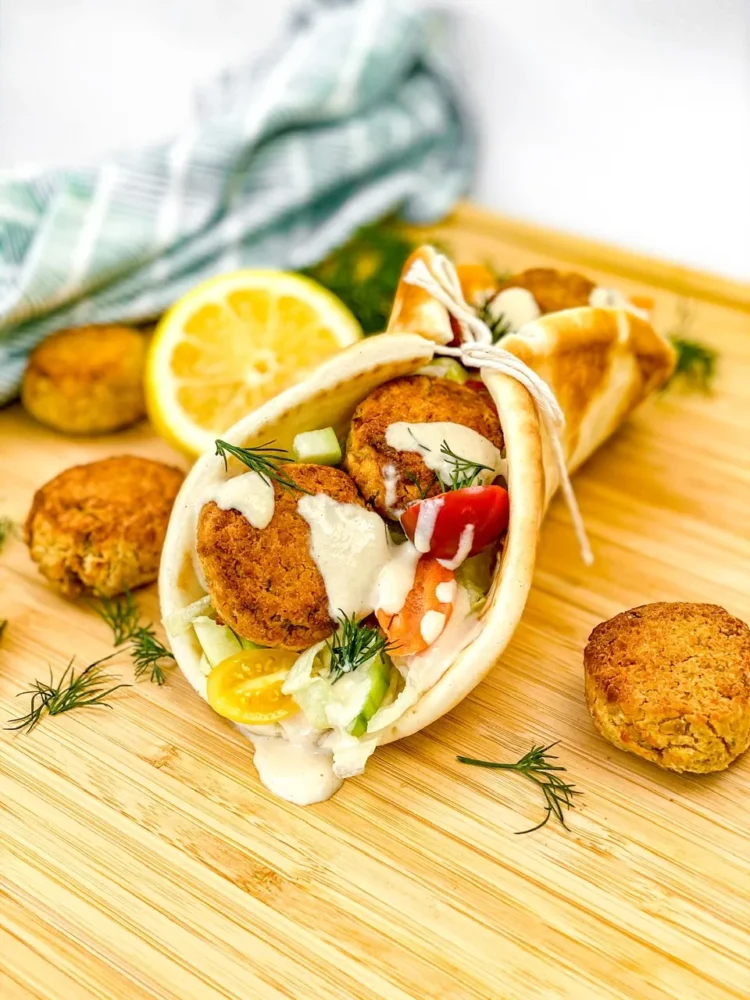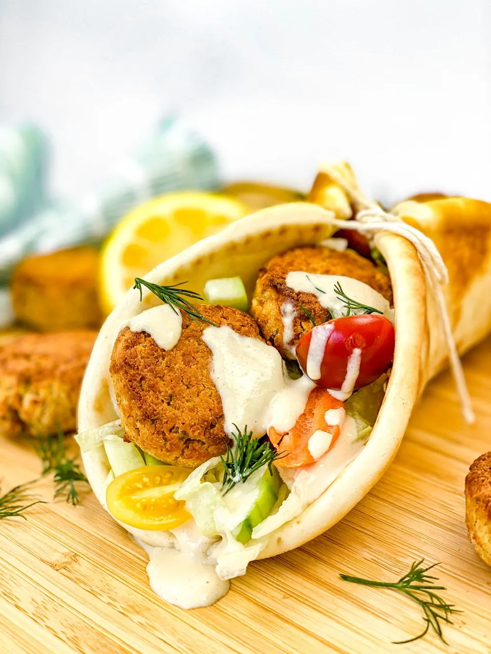 I like a classic tahini sauce with these but you can use any dressing you have on hand. I tend to overstuff mine and it gets quite messy to eat. You can always wrap it up in some paper or foil to make sure it doesn’t drip or fall out the other end on you. Or eat over the sink like I did.