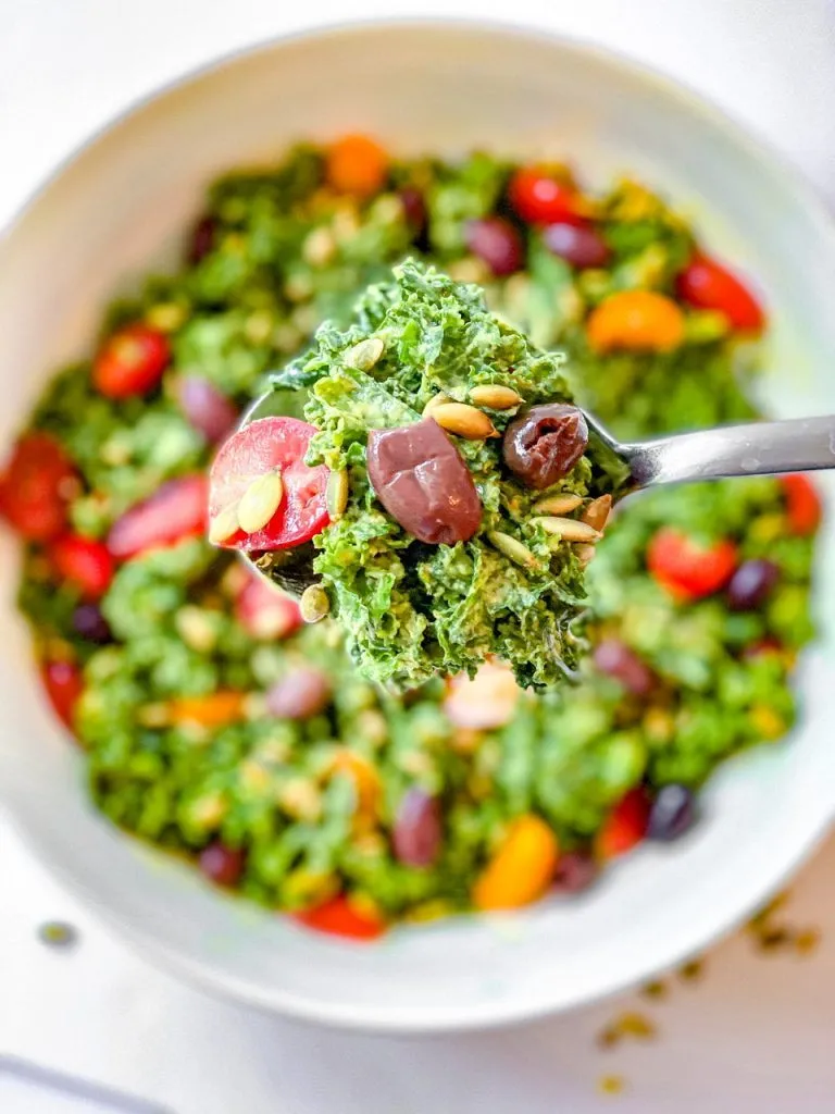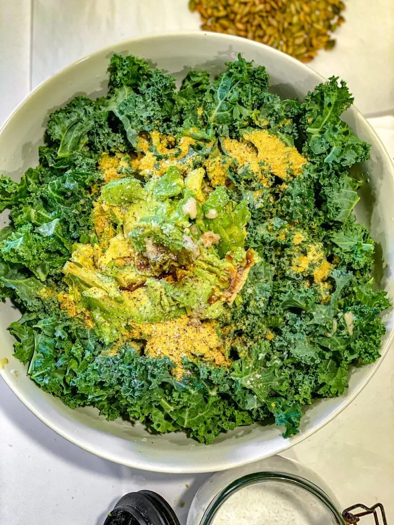 You also should mix this with your clean hands. It’s the only way to massage the kale properly (I know, cringe worthy) but it’s essential to break it down and soften it.