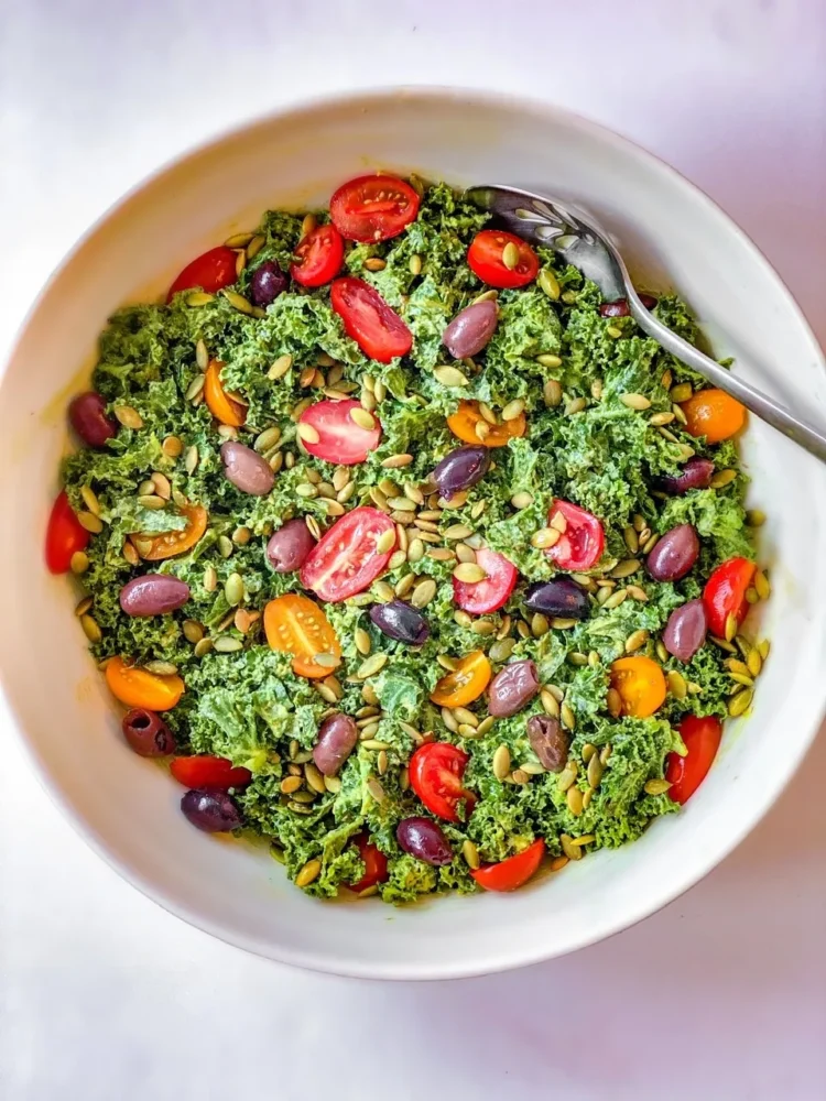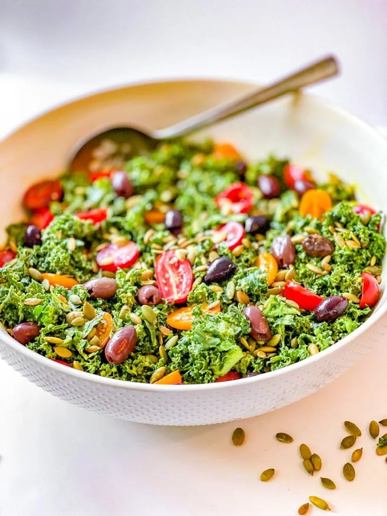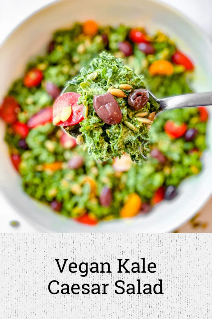 This is a kale Caesar salad I’ve been making for over 10 years and it’s one of those go to dishes I make for a starter or most often a main dish. It’s garlicky and savory and crunchy from toasted pepitas which are the icing on the salad so to speak. I’m not a huge fan of croutons in salad. Cue gasp. They often get soggy or are too crunchy and get in the way in my opinion, but you are certainly entitled to tell me to eff off.