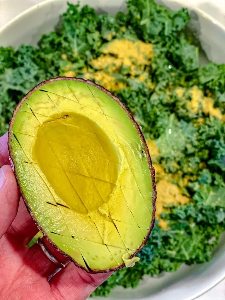 There’s a few key things you need to have success in making this salad. One is ripe avocados and the other is removing the tough stems and ribs from the kale. You can use either traditional curly kale or the lacinato or Dino kale variety in this salad. I often use bagged chopped kale to save time, but I still go through and remove the tougher ribs. No one wants to eat those. You can strip them easily by holding the stem in one hand and then using your other to grasp the leaves and pull them away essentially “stripping” them off the stem.