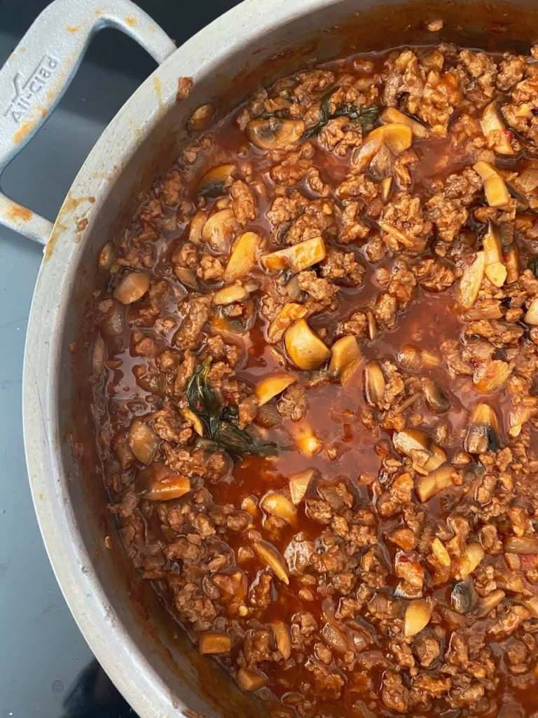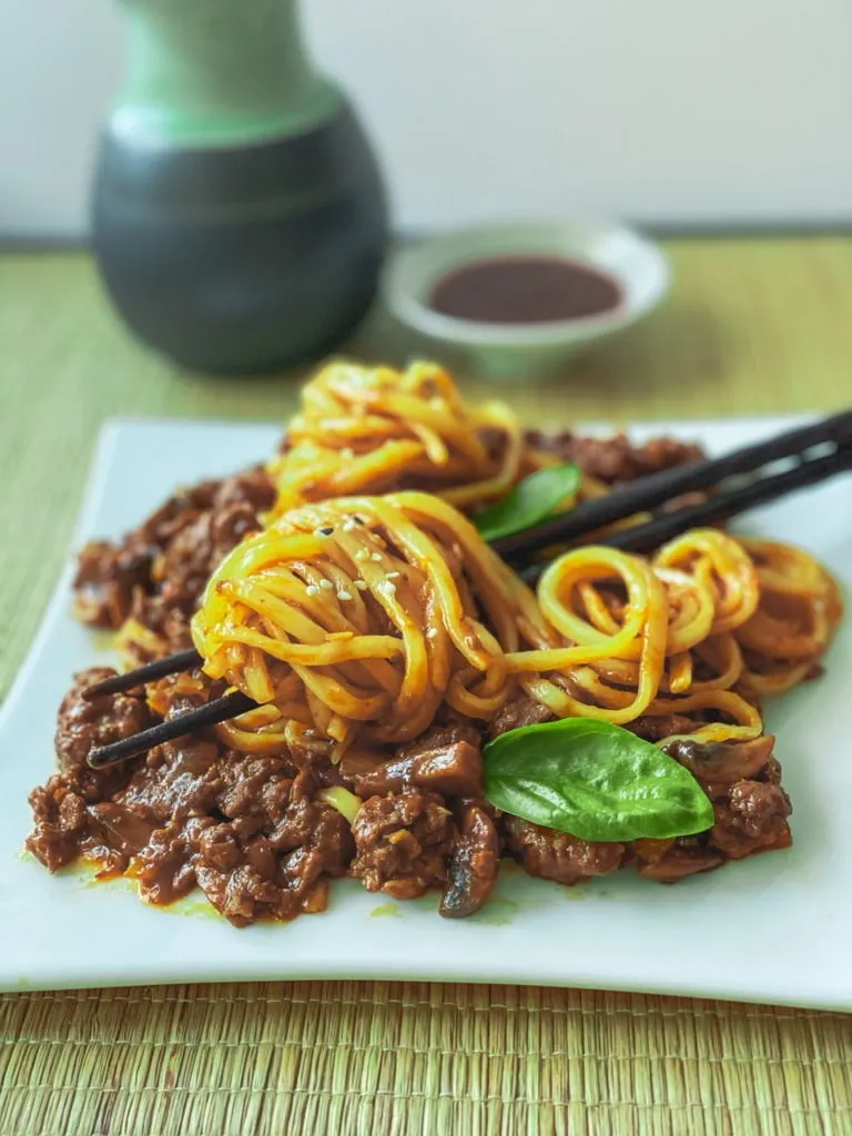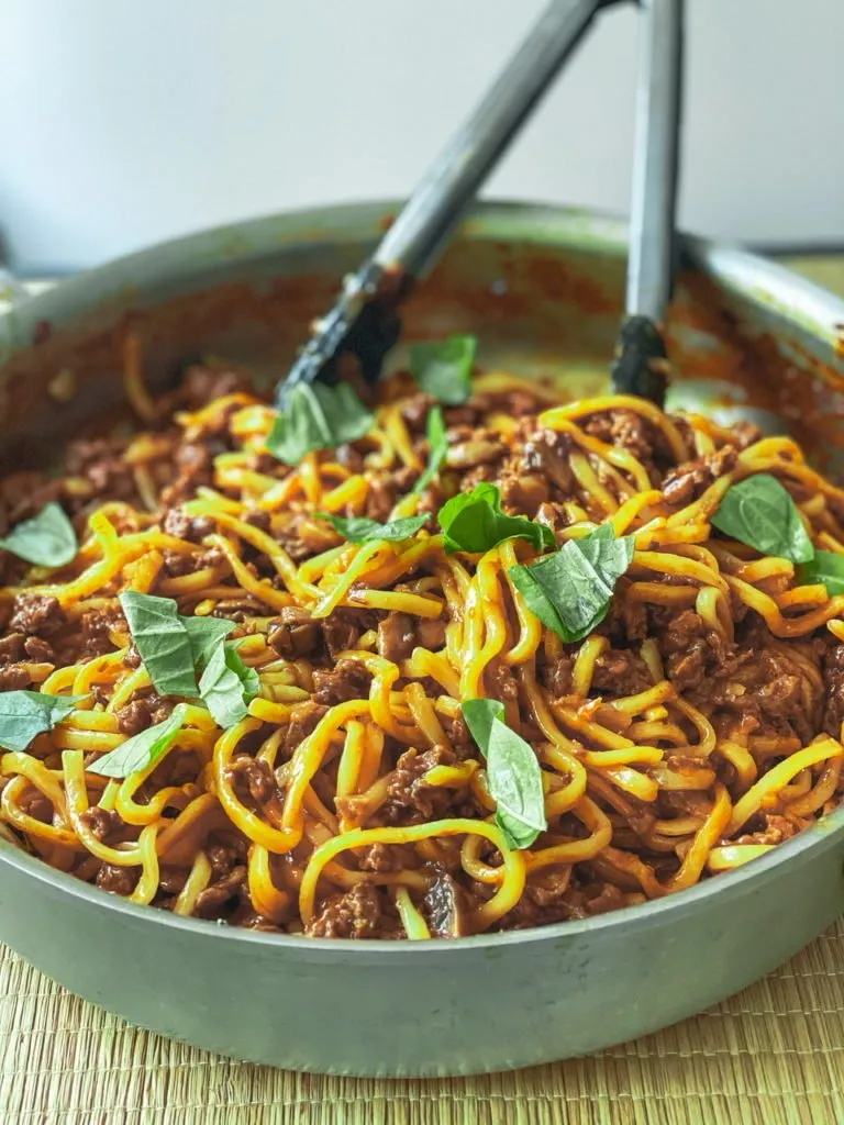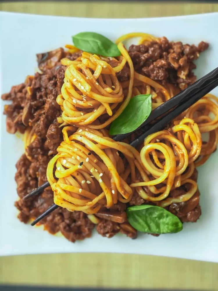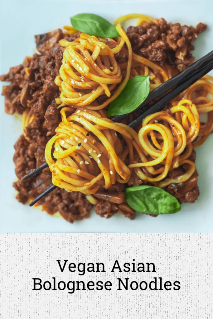 To be honest, I never really make a traditional Italian Bolognese sauce, but I do love a spicy noodle so I thought why not combine Asian flavors with vegan ground beef and spicy sambal oelek and see what happens? What happened is an amazing fiery rich noodle dish that really satisfies.