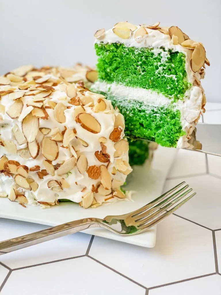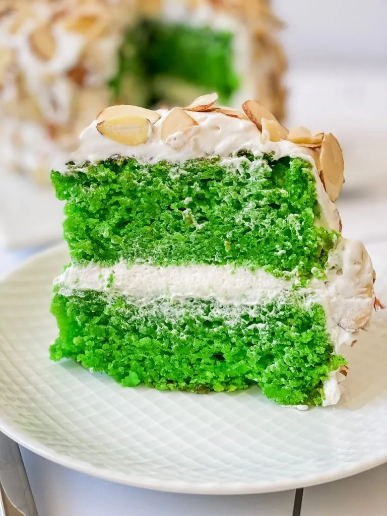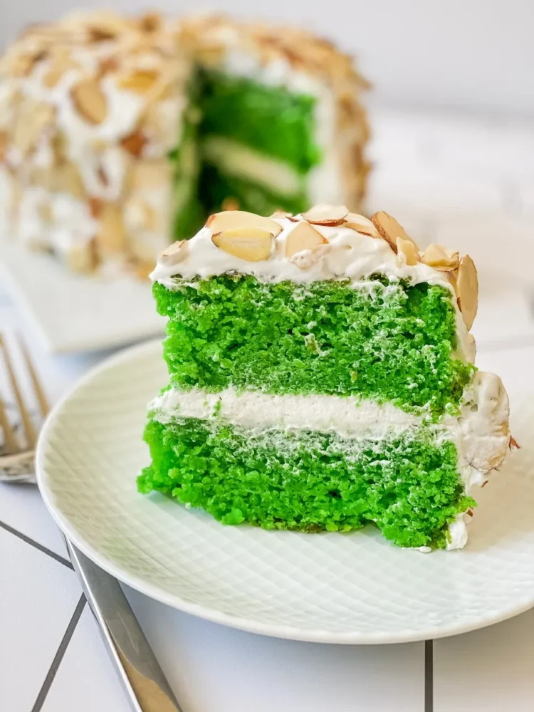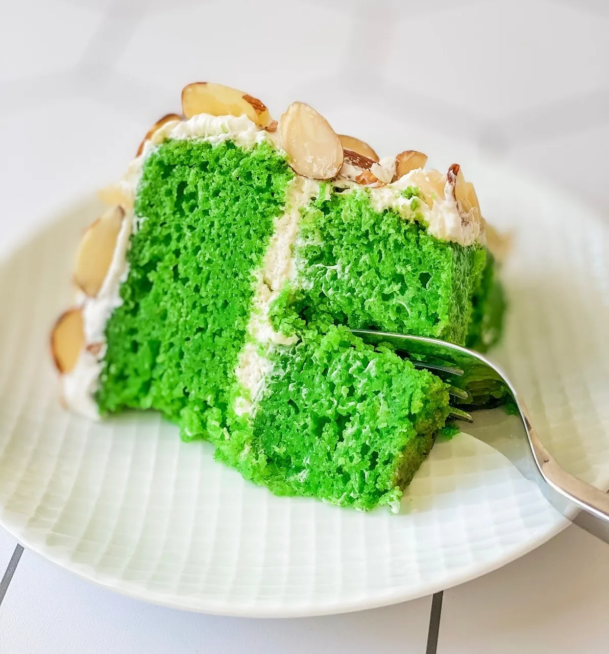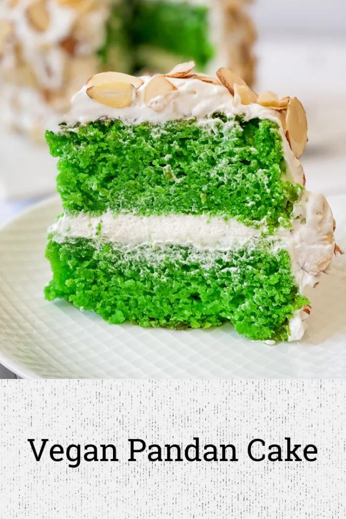 It’s my birthday and I’ve been obsessed with a cake we had many times at one of The Loving Hut restaurants here in Florida. They didn’t have many desserts on the menu but there was one that interested us and it was called a Pandan cake. It was a green hued cake with whipped cream as frosting and sliced almonds on top. It had a distinct flavor from the Pandan. Sort of earthy and hard to describe, but delicious. I thought I could never make this at home until finding a Pandan extract on Amazon (link to purchase at the end of this post). Read more about Pandan here. They do sell Pandan leaves at some Asian markets so if you want to go that route, go for it!