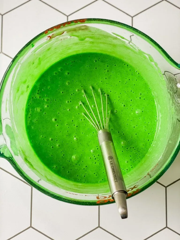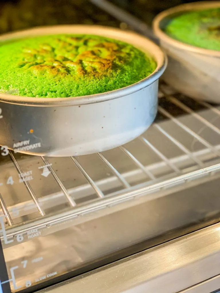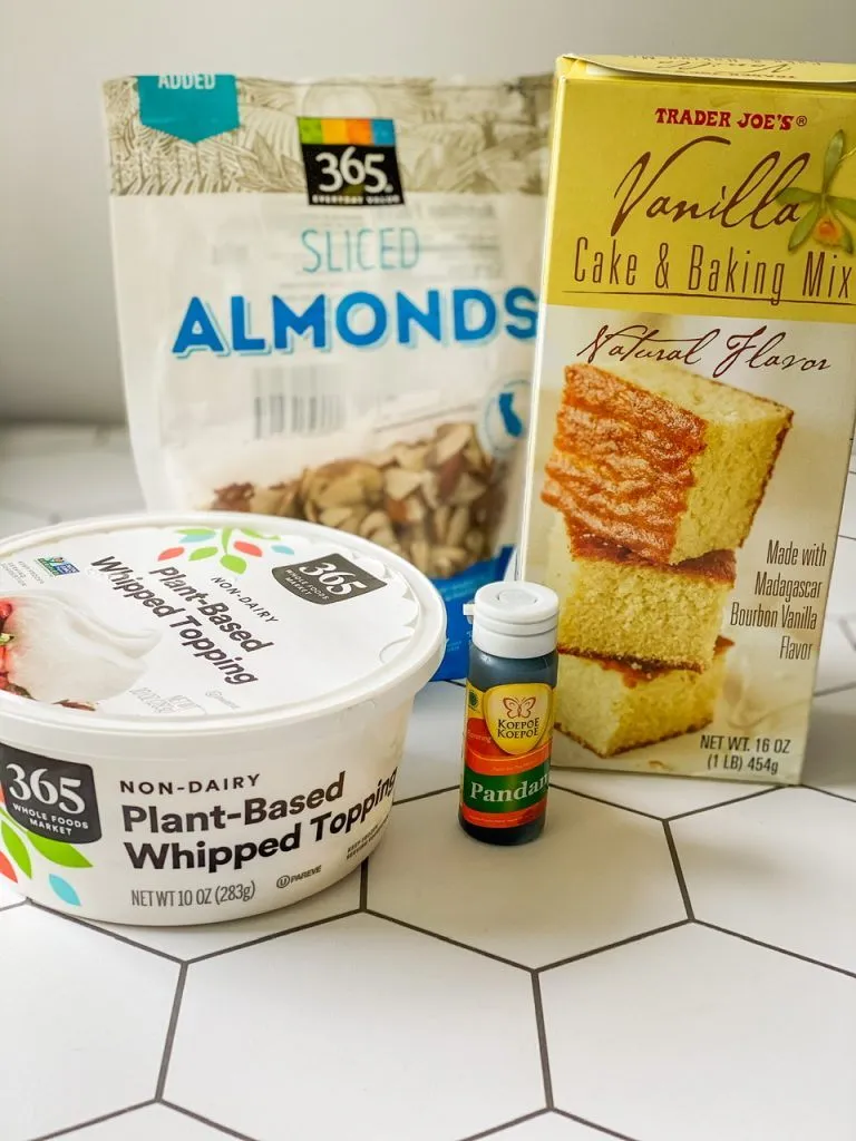 I decided to use a boxed cake mix to simplify the recipe and the vanilla cake mix from Trader Joe’s worked perfectly. You could use another boxed mix or make your favorite vegan vanilla cake from scratch. I used aquafaba as the egg replacer and vegan butter and then a teaspoon of the Pandan extract and it was perfect. Tasted almost identical to the cake I remembered!