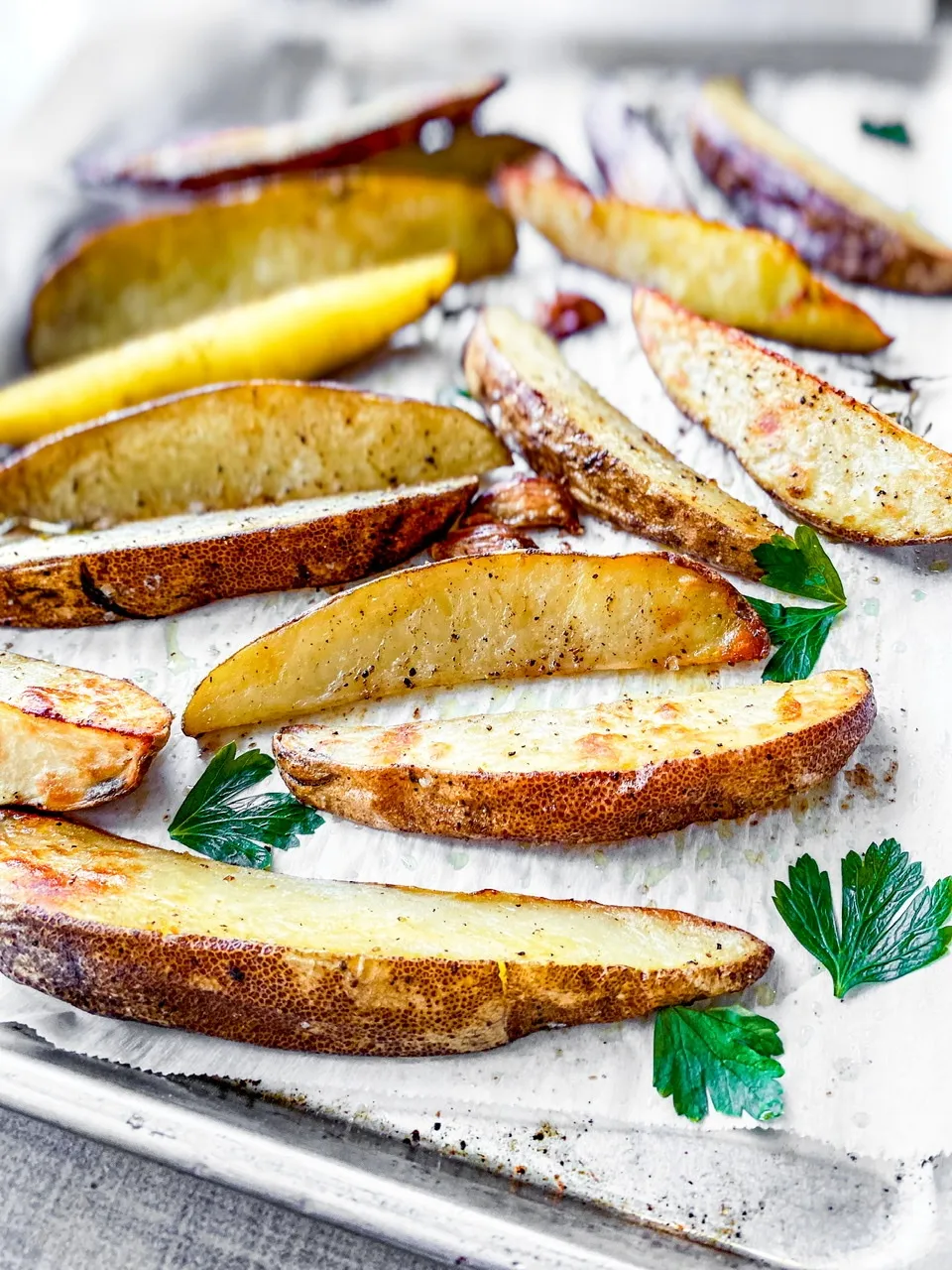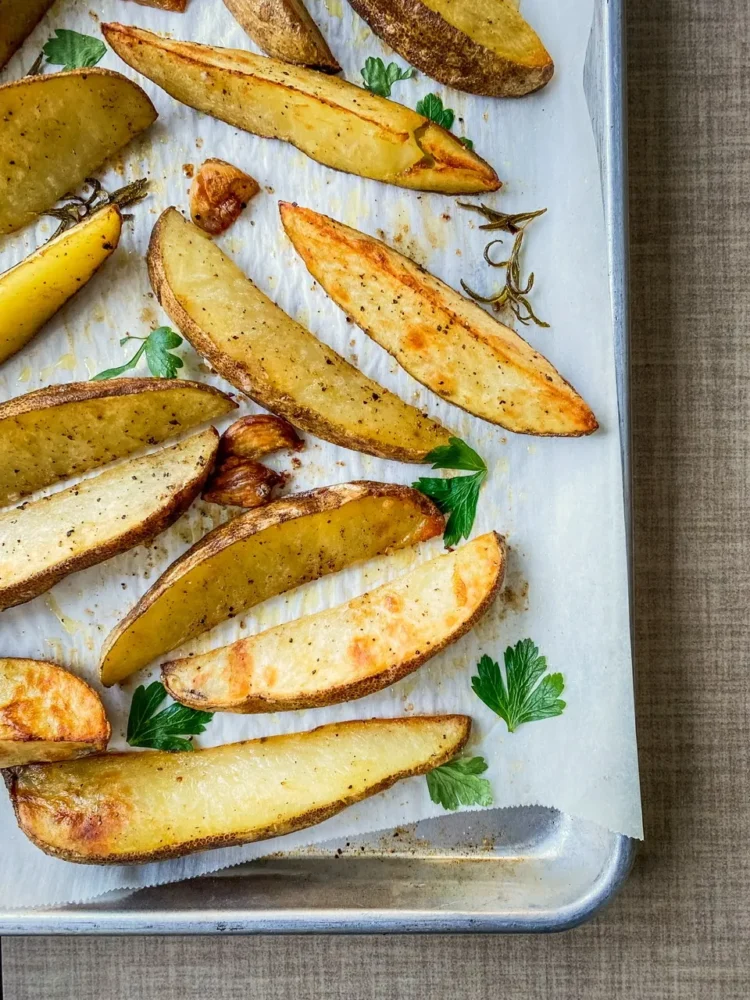 Don’t crowd your potatoes when baking them. If you do, they will steam rather than roast resulting in a soggy potato and no one wants that. You also need a hot temp to make them crispy and tasty. You can also preheat your pan in the oven for five minutes prior to adding the potatoes and that will give them a great start at crisping.