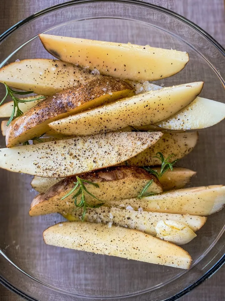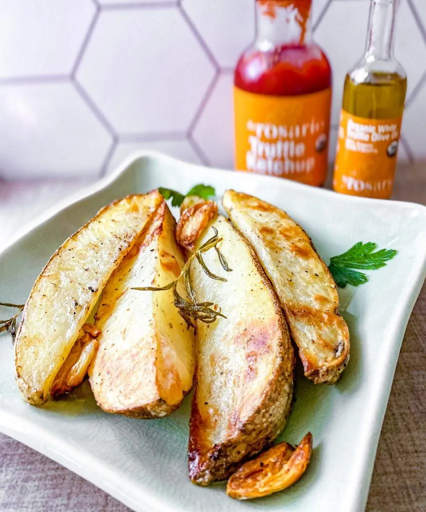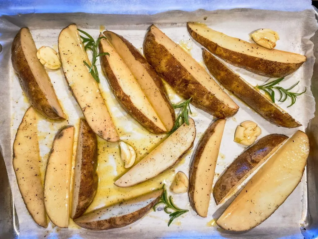 Potatoes need a fair bit of salt. If you avoid salt then they will be bland sorry. They’re just one of those vegetables that must have it to taste good. Lots of garlic, cracked fresh pepper and rosemary round out the list of ingredients.