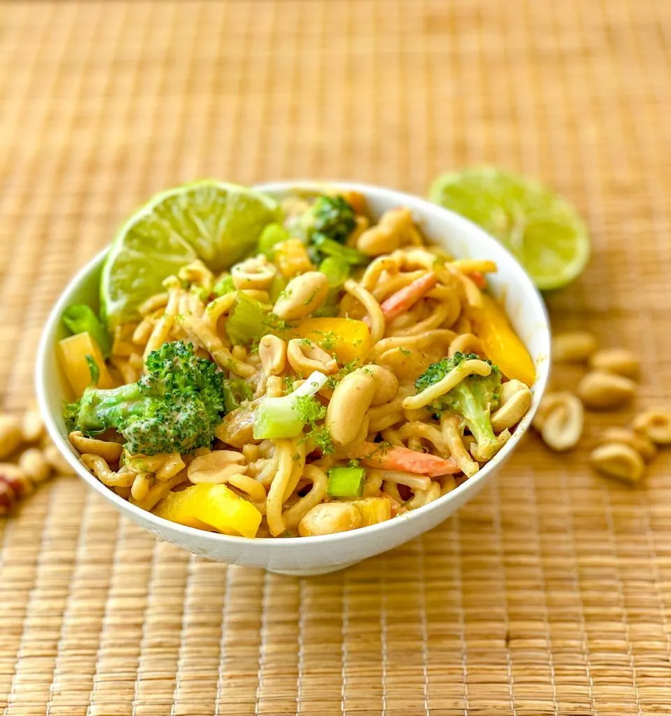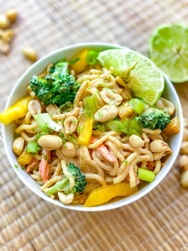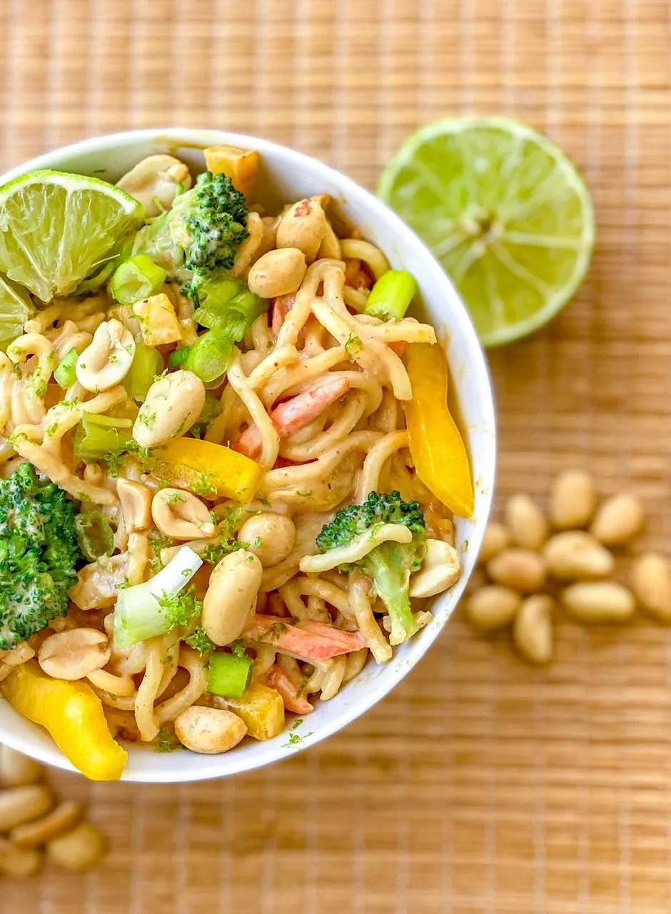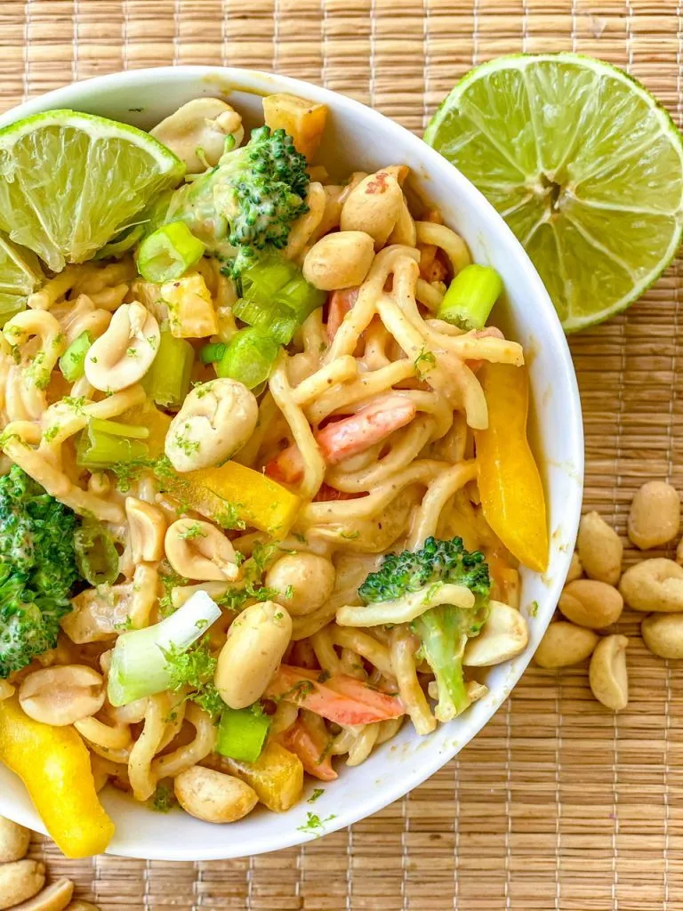 This recipe is worth it for the peanut sauce recipe alone. I use it on so many things. Dipping sauce for spring rolls, on a Bahn Mi sandwich and of course in this noodle salad. It’s savory, sweet, salty and crave worthy. You can make it spicier if you like it hot or completely mild if you prefer. I’ve even used the sauce hot in a stir fry with added coconut milk and oh boy is that good.