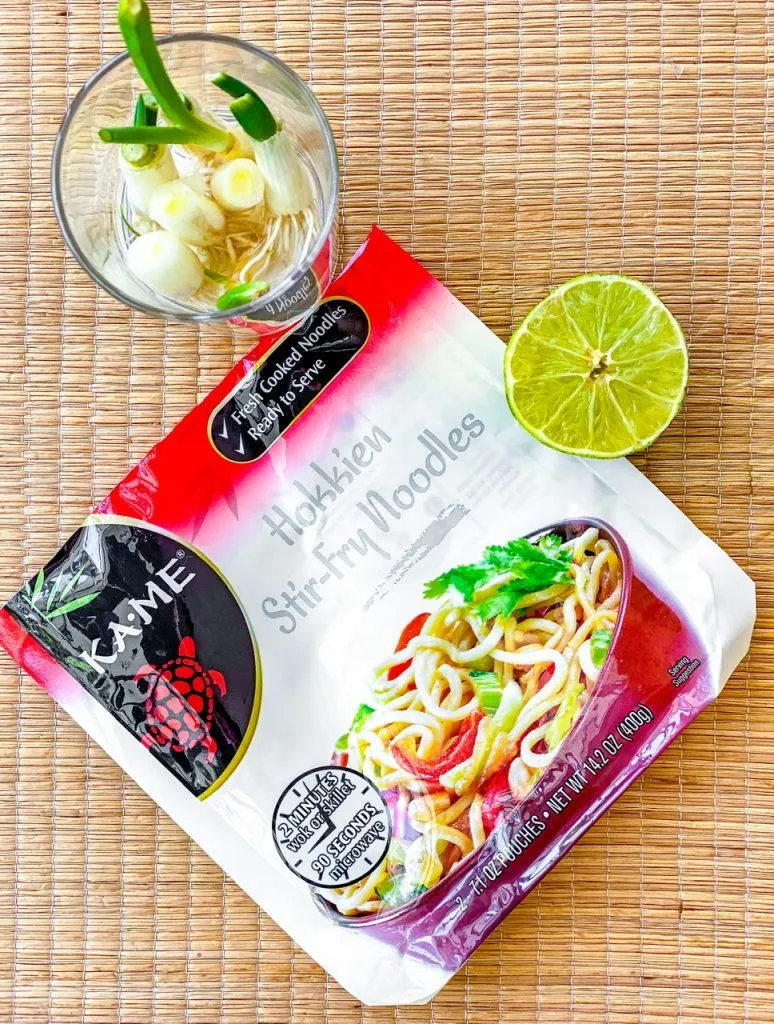 I used a fresh noodle for this dish, but you could certainly cook a dry pasta like linguine and use that although fresh is best. The veggies are really versatile in this as well and you could go through a clean out the fridge route and use up what you have but I’ve used the classics here: broccoli, peppers, carrots and scallions.