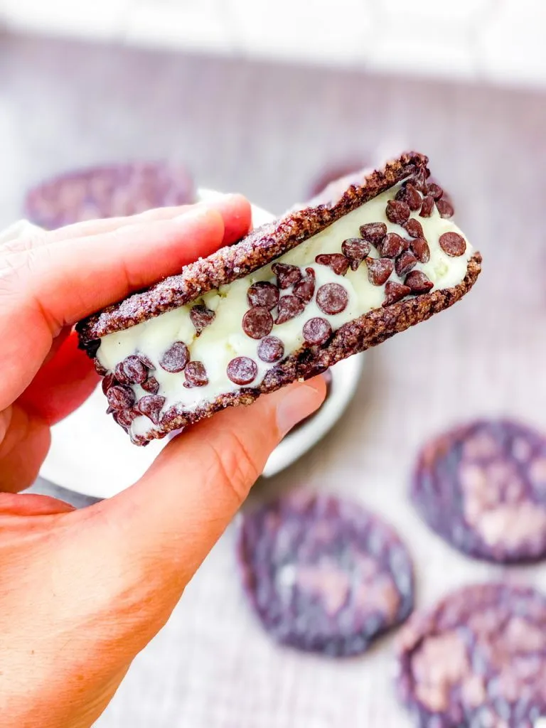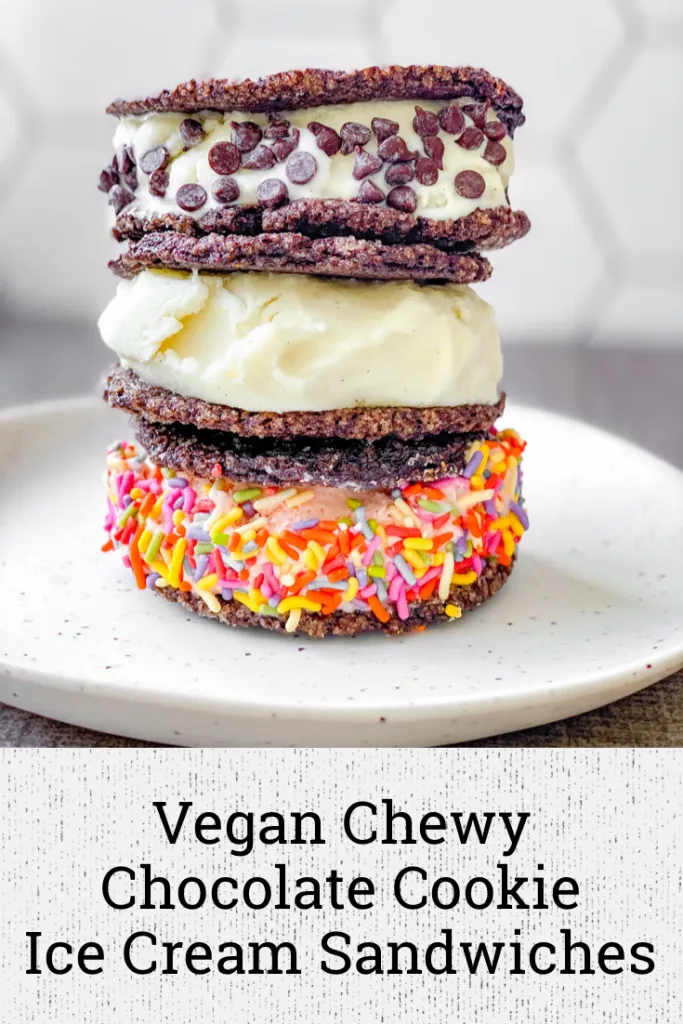 It’s National ice cream sandwich day! Now’s my chance to feature a cookie that’s chewy, super chocolate-y and perfect for sandwiching with vegan ice cream! Don’t get me wrong, they’re great on their own, so feel free to enjoy them as is. I usually freeze about half the batch to make when I need a quick cookie fix and then you don’t feel guilty about having to eat them all at once. Unless you want to then by all means, chomp away!