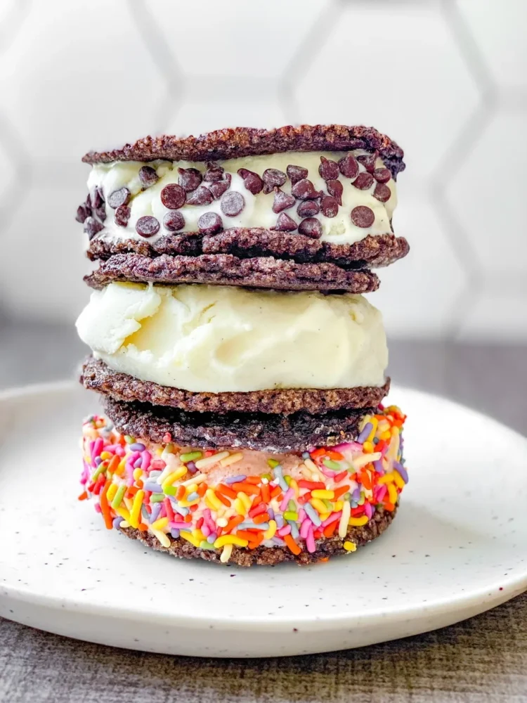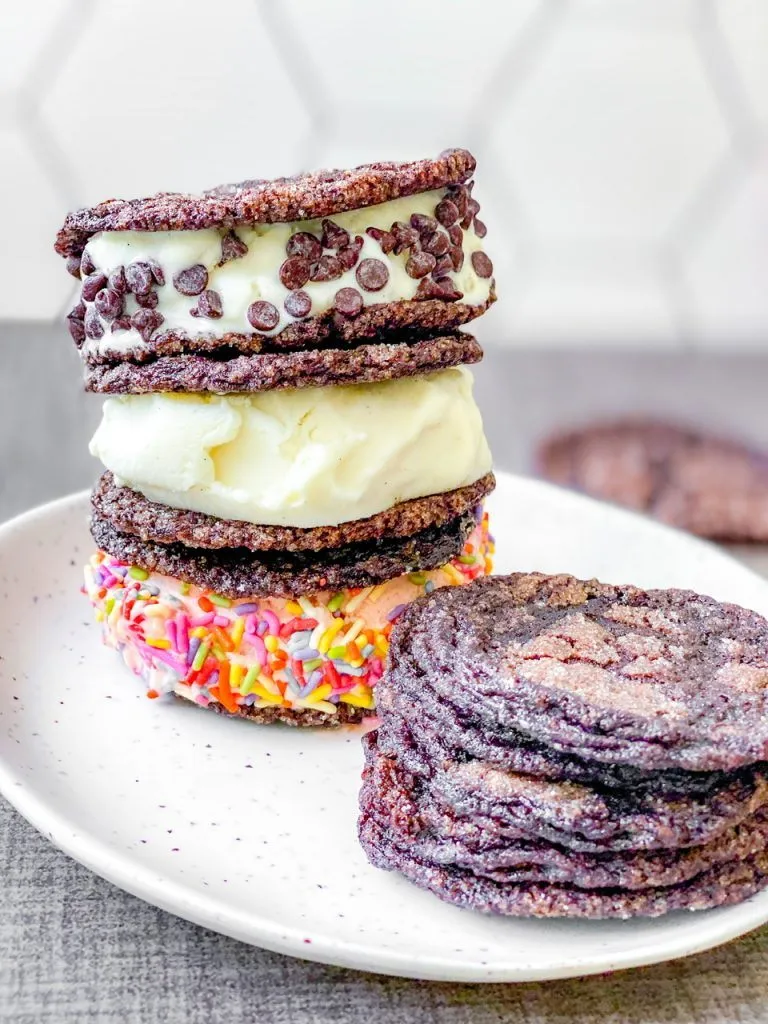 Once the cookies are baked and cooled, you can use any vegan ice cream you’d like to fill them with. The combinations are endless so go crazy with your favorite flavors. You can also roll the edges in sprinkles, nuts or chocolate chips to really turn the volume up to 11.