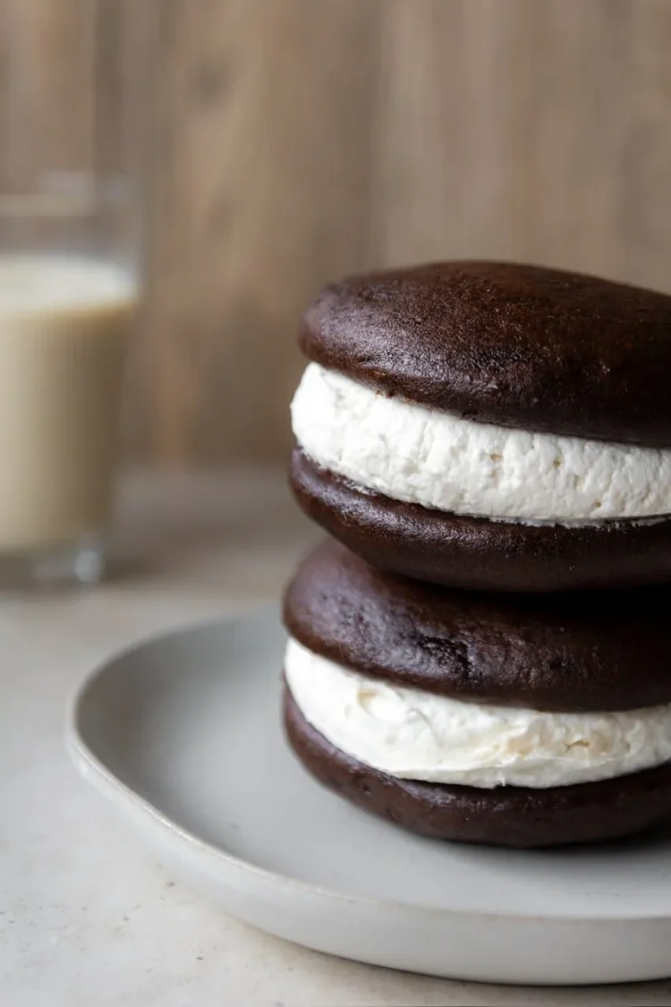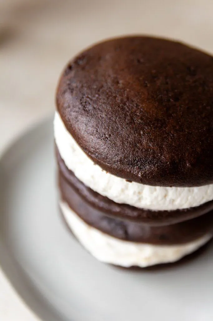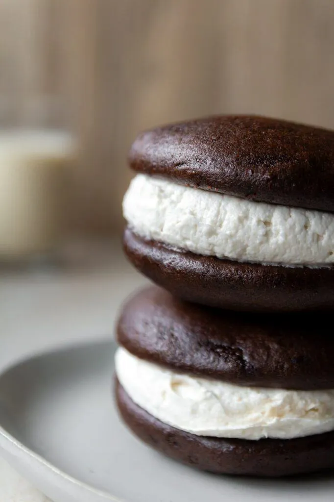 • No shortening in the batter. I’m using vegetable oil instead as I feel the shortening made the Whoopie pies drier than I wanted. Oil keeps these more moist so use a plain vegetable oil and nothing strong like olive or coconut oil. I still feel shortening is best for the filling as it’s what the Amish use and it tastes authentic and you could use vegan butter but know that it will taste different.