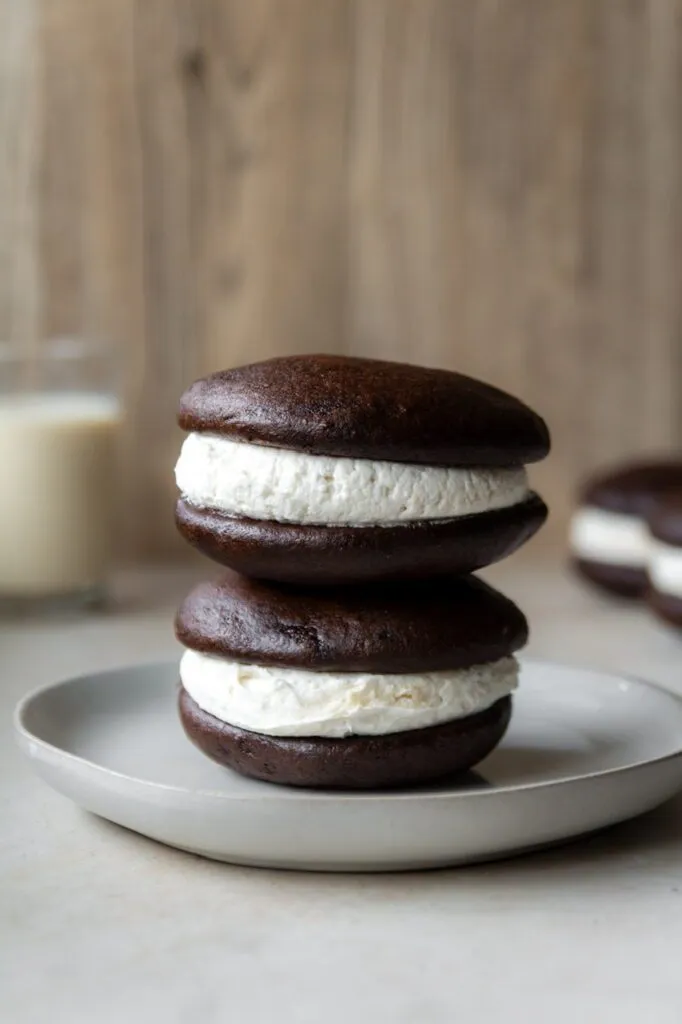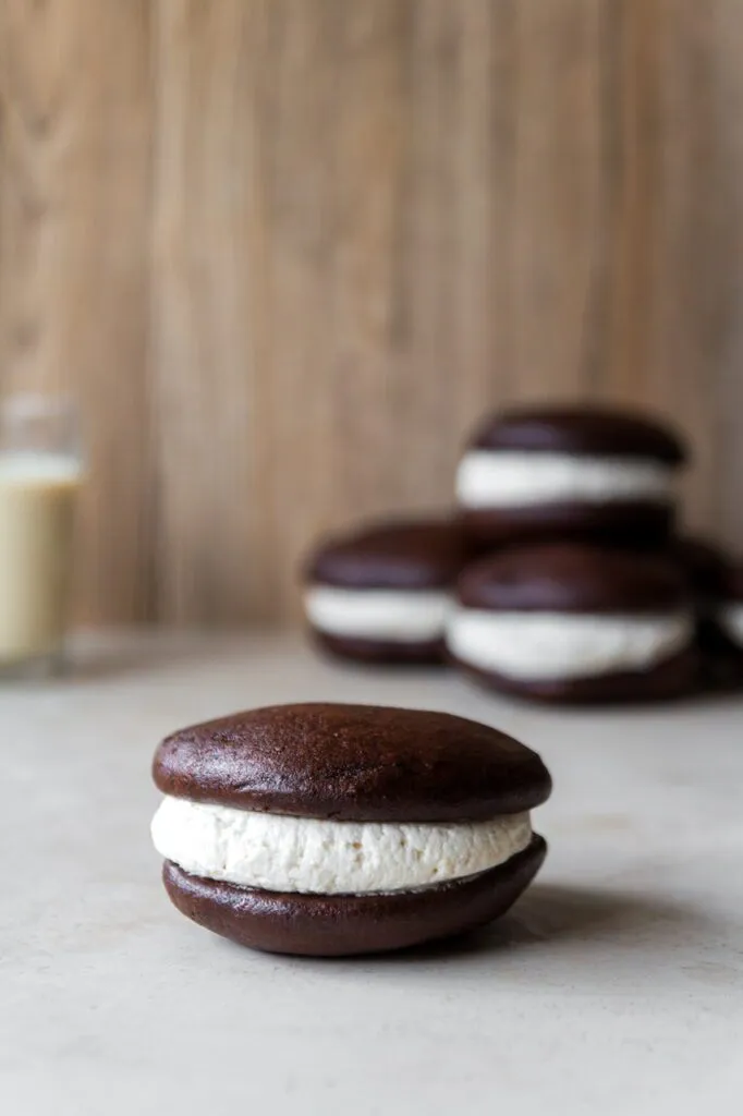 Whoopie pies are a comforting hand held snack cake that I first discovered as a kid in a trip to Amish country in Pennsylvania. My Aunt Nikki gave me her original recipe many years ago and I veganized it and made tweaks here and there over the years. She was raised Mennonite (not as strict as old order Amish) but converted after marrying my uncle I guess. She was the best cook in our family and everything she made was incredible and I would look forward to Thanksgiving at their house in Long Island every other year. She’s passed on now but I always think of her fondly when I make her recipes.