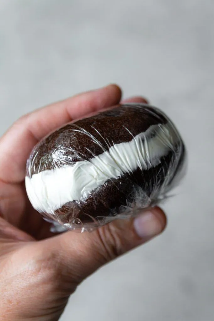 • Store by wrapping individually in plastic wrap or wax paper. For plastic wrap, cut a piece slightly larger than the Whoopie pie then twist the bottom tight until wrapped completely around the pie. For wax paper, roll up and twist the ends on each side and tuck under. Store in the fridge if not eating right away. These will also freeze well.