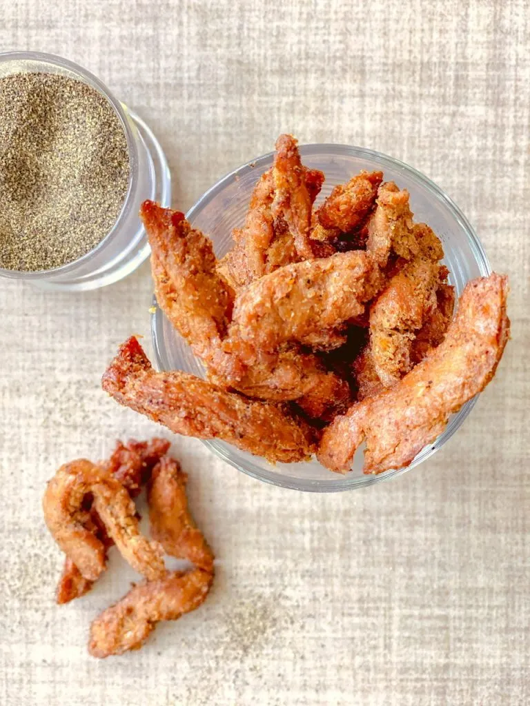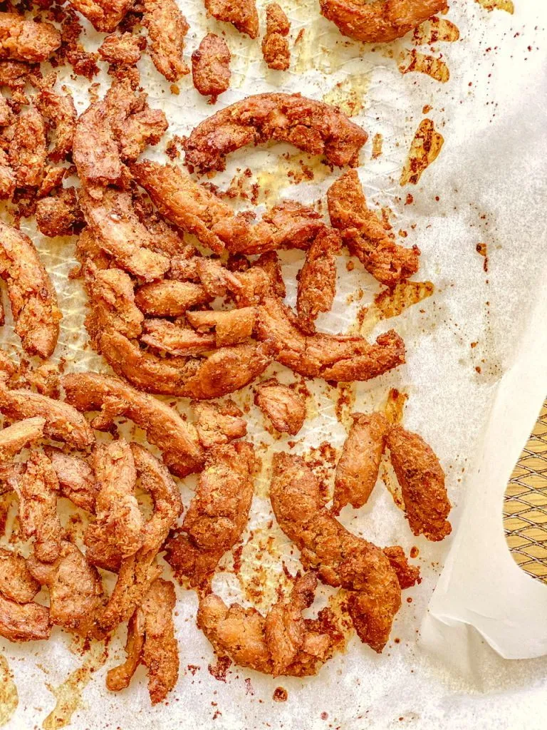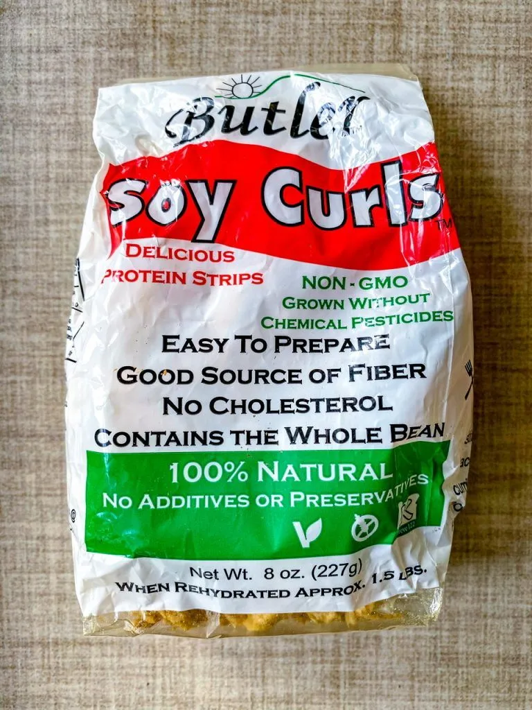 Butler soy curls are pretty much the only commercial ones out there and if you can buy them at a store locally then you’re lucky. If not, I am including an Amazon affiliate link at the bottom of the recipe you can use to order some. This recipe makes a big batch using only half of the curls so they’re not too expensive if you measure them against the cost of prepacked retail varieties.