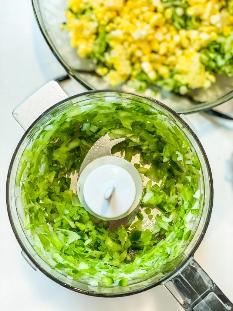 The easiest way to chop the scallions and jalapeño is to use a mini food processor. You can always chop by hand if you don’t have one just make sure to make them diced pretty fine. After that, it’s pretty quick work to toss everything together.