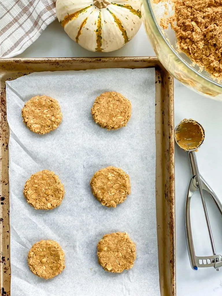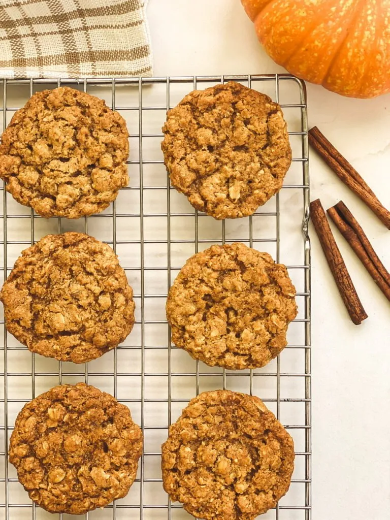Best to use rolled oats in the cookies, but if you only have quick oats those will work but the cookies may not have as much flavor. I used a pumpkin spice blend in these but if you don’t have any on hand, you can make your own. Just mix together 4 teaspoons ground cinnamon, 2 teaspoons ground ginger, 1 teaspoon ground cloves and 1/2 teaspoon ground nutmeg. You’ll only need one teaspoon so store the rest in a small container to use later.