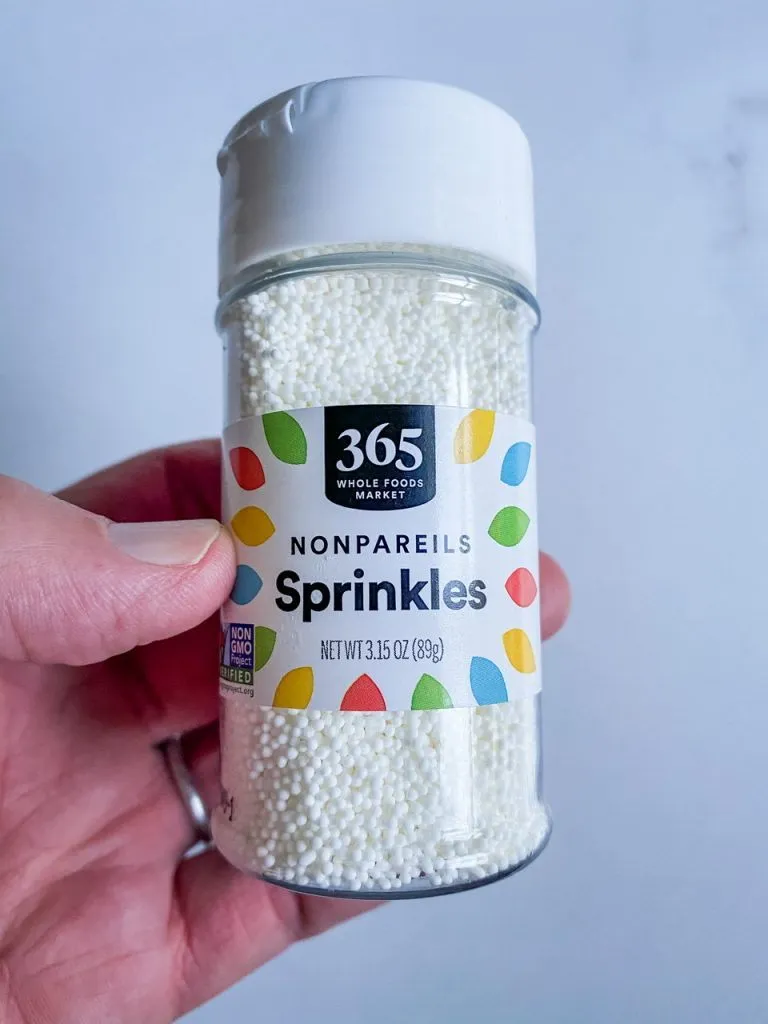 Another traditional element to these are nonpareil sprinkles and glacèed or candied fruits and nuts. A lot of sprinkles are not vegan as they contain confectioners glaze which is derived from insects. I found vegan white nonpareil sprinkles at Whole Foods Market and I use sliced almonds. Truth be told, I hate candied fruits so I leave them out. Plus, they ruin the aesthetic of my white Christmas version, but feel free to add them if you like them!