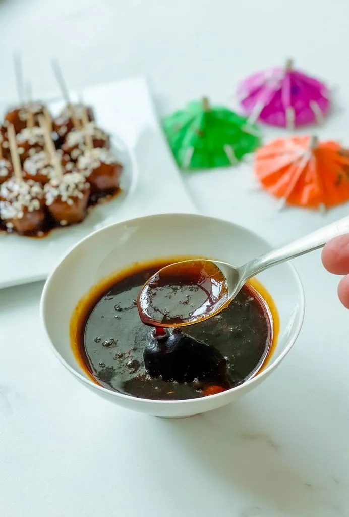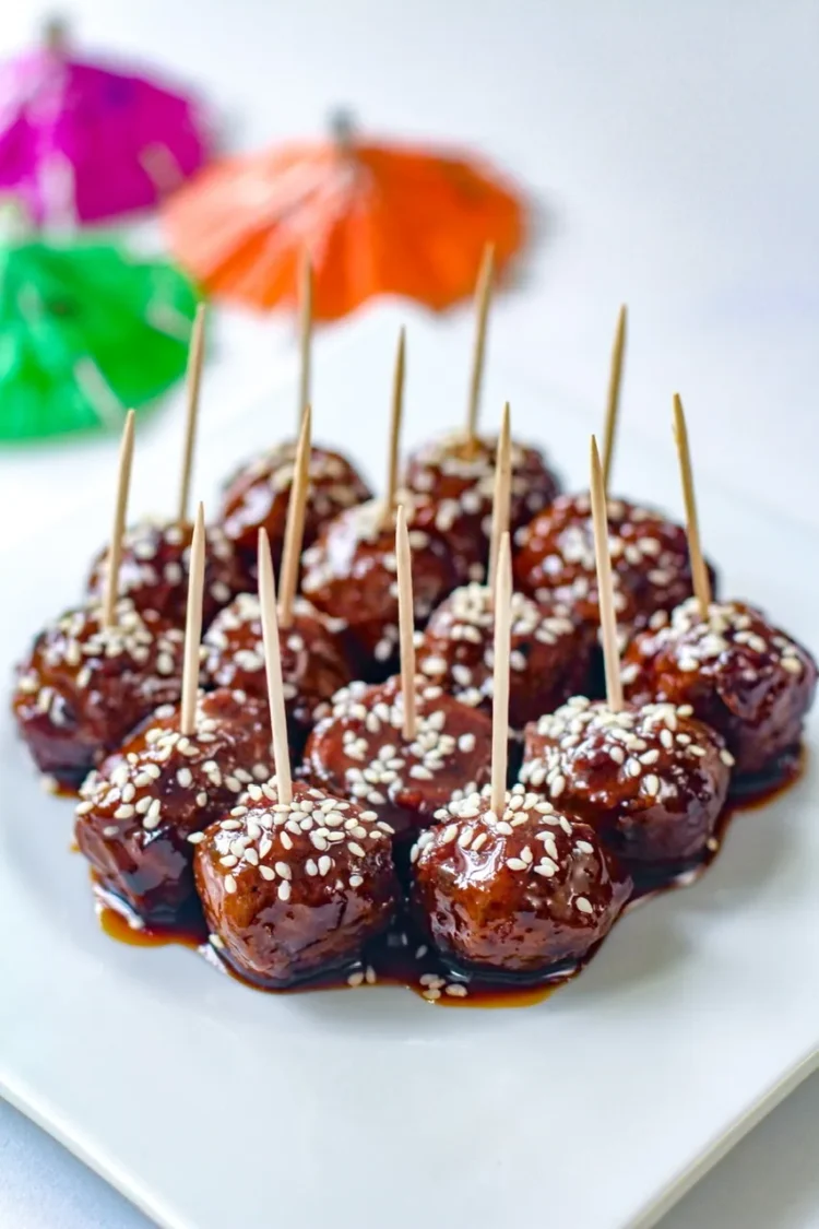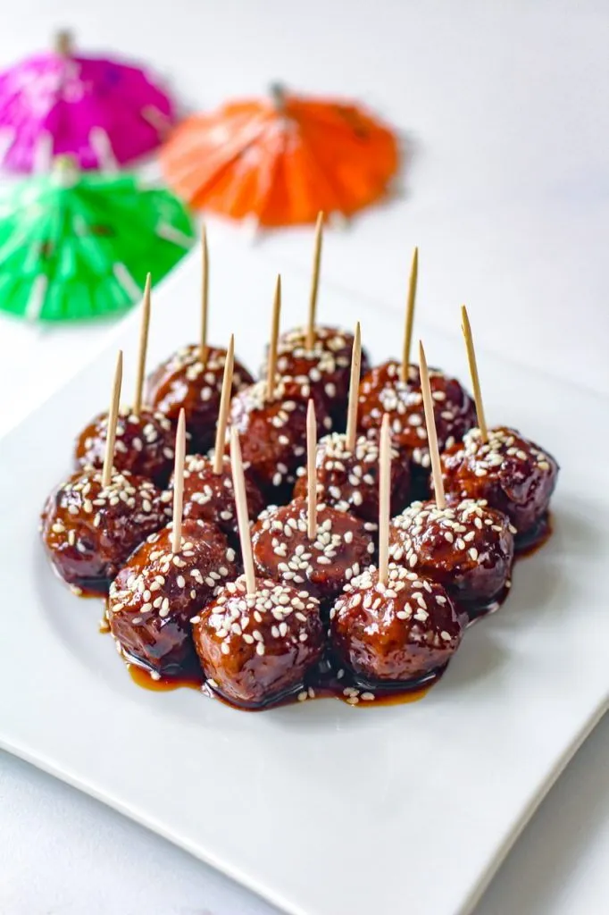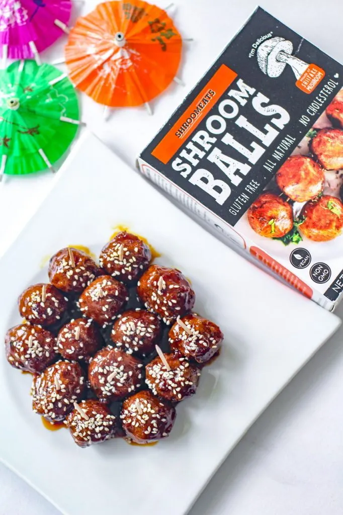 For the meatballs, there are so many out there to choose from that are pre-made but you could certainly make your own. I used one made of mushrooms and they were really tasty once glazed! A sprinkle of sesame seeds were all they needed to be dressed for the party!