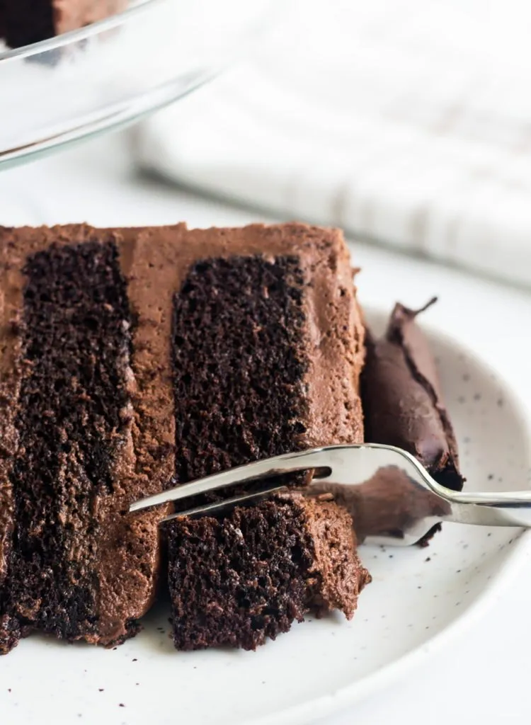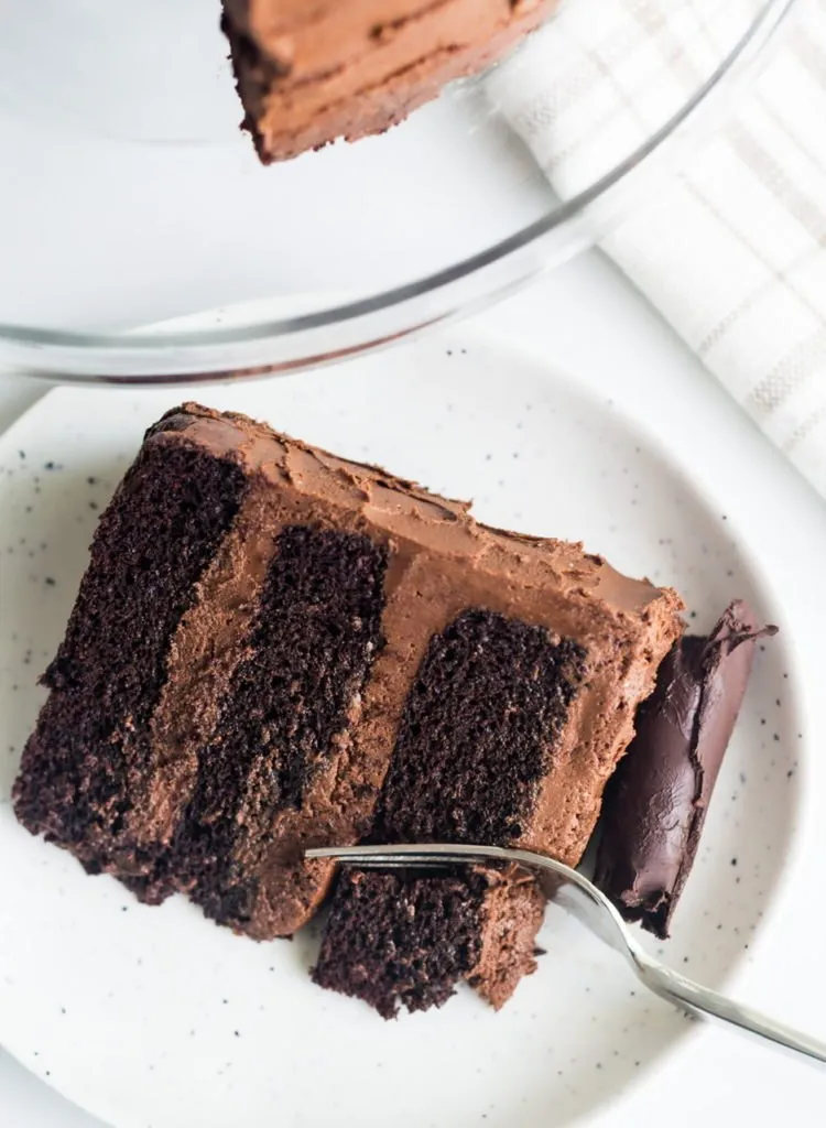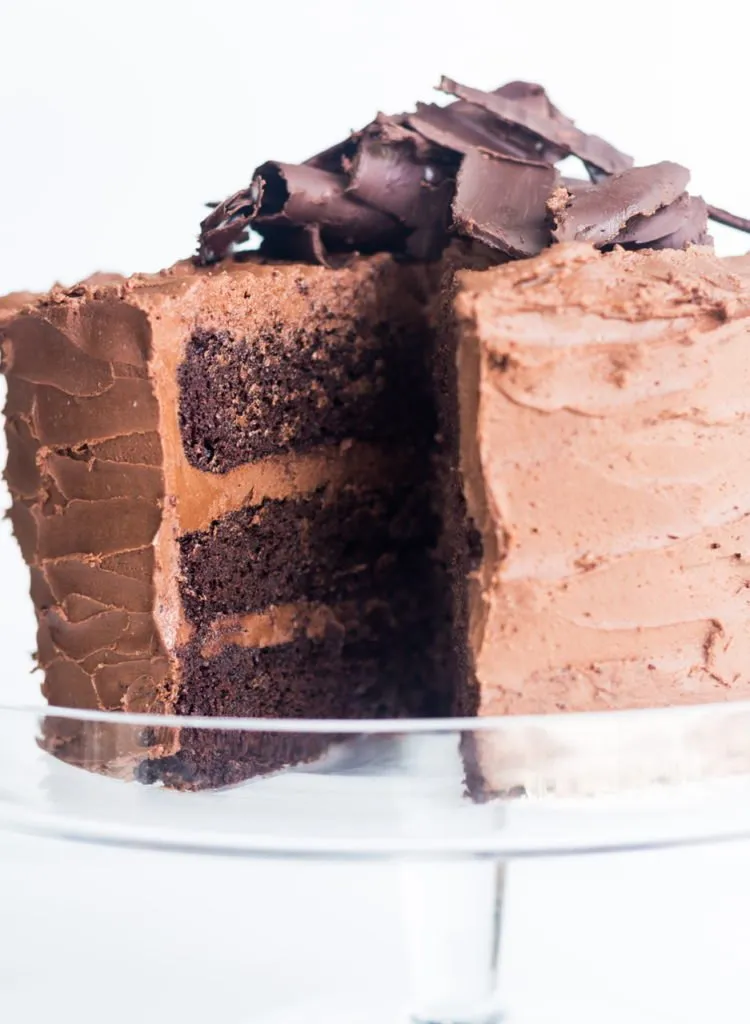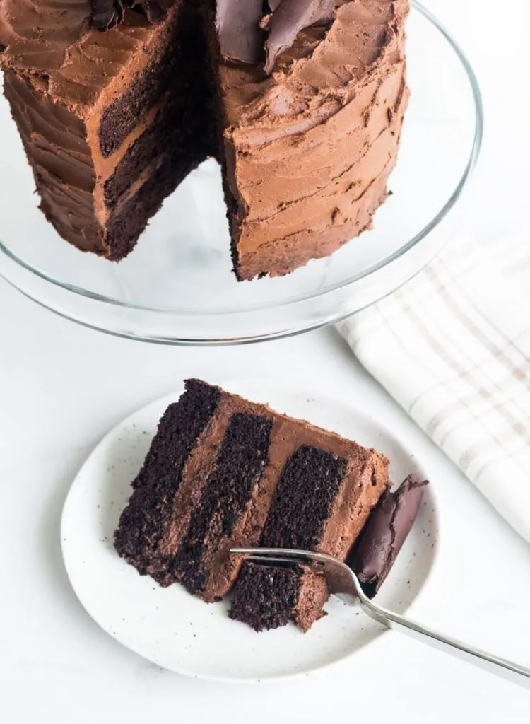 I’ve been experimenting with vegan chocolate cake recipes for years, but I think I’ve finally landed on a perfect recipe that’s moist but also has structure and doesn’t fall apart. I also wanted a cake with no special egg substitutes so applesauce is something most have on hand so that’s what we’re using here.