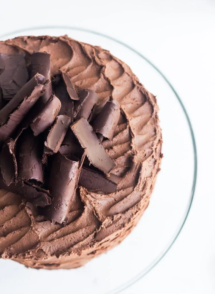I decided to gild the lily by adding chocolate curls to the finished cake. They’re actually not that hard to make. You just need to chill a metal cookie sheet or brownie pan then add melted chocolate and spread it on the backside of the pan with an offset spatula until it’s cooled. Then using a bench scraper, you roll shards of chocolate into curls to top the cake. There are plenty of tutorials online showing the process so if you want to go big and dress to impress, make some curls.