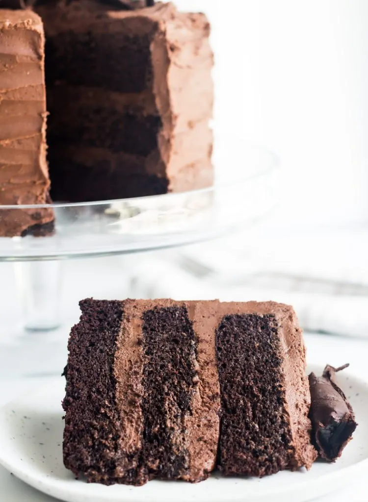 This recipe makes three 8 inch layers for a show stopping layer cake, but can be made as two 9 inch layers or even in a sheet pan if you prefer. If making round layers, you should prep the pans properly to ensure an easy and full release of the cake. This includes making parchment paper rounds to line the bottoms. I also prefer aluminum cake pans versus those with a dark nonstick coating. They cook more evenly and you’ll get a better rise in your cake. If using a nonstick or a glass pan, I would reduce the heat 25° to 325° so your cakes do not burn.