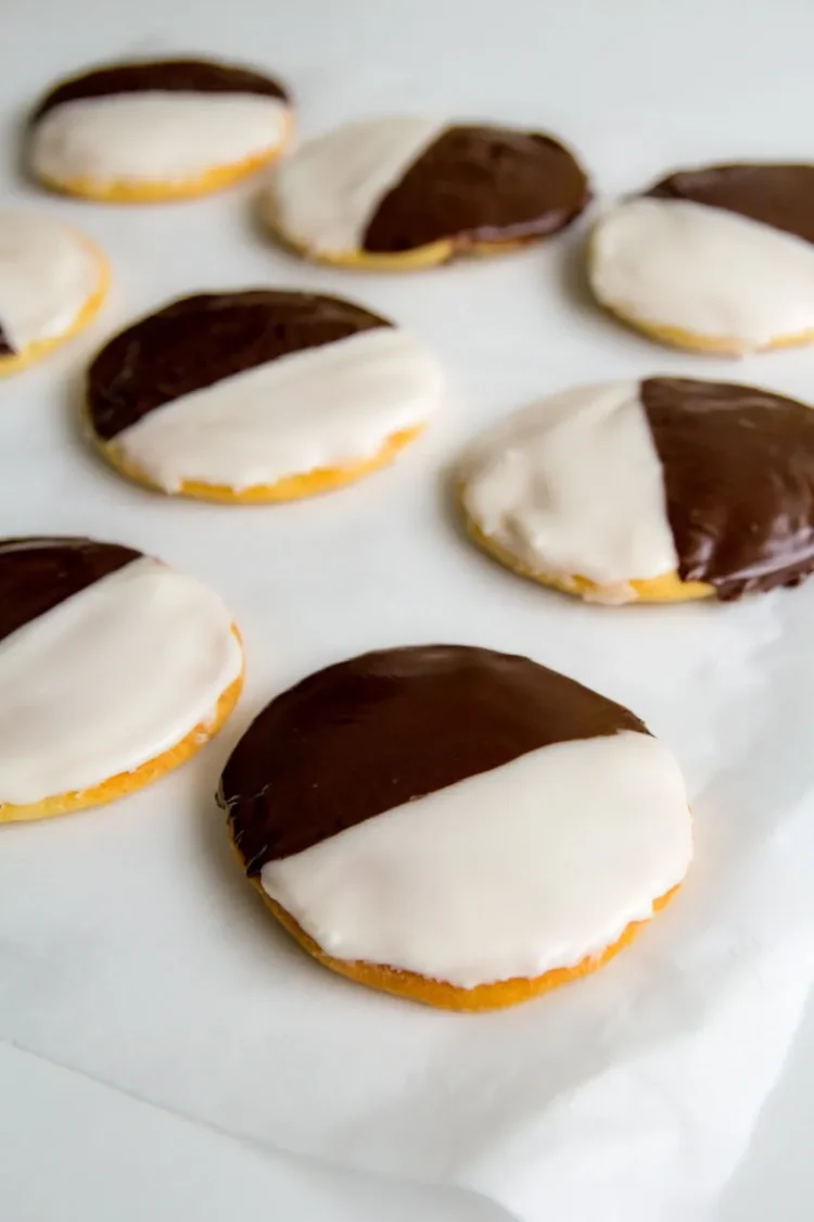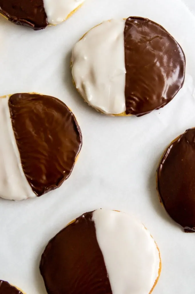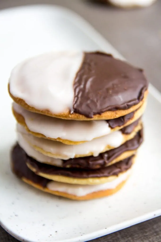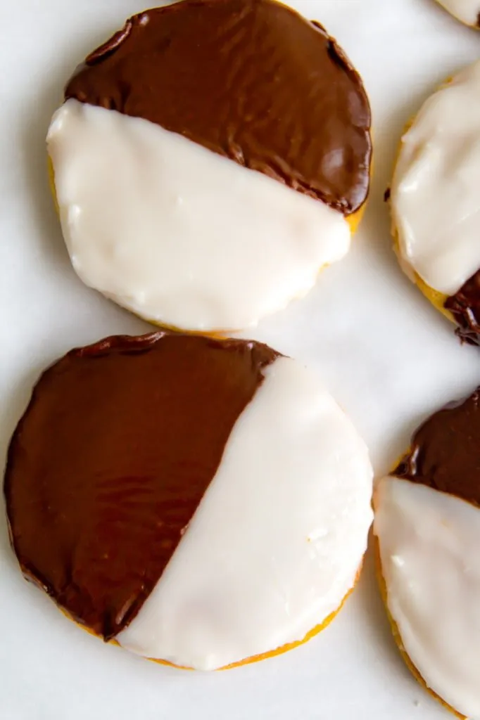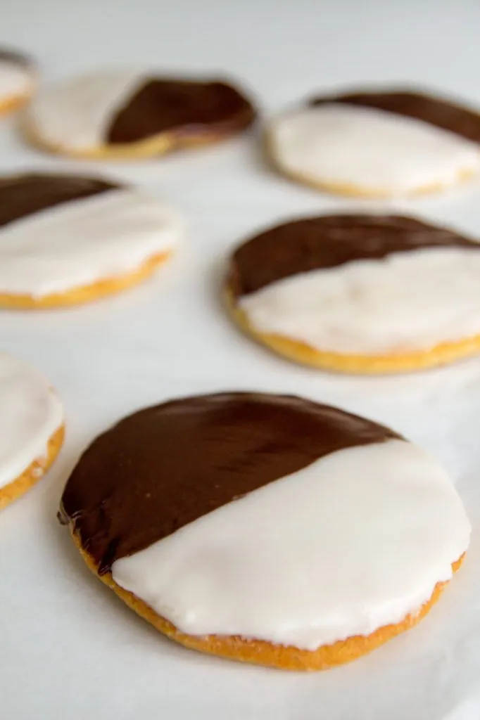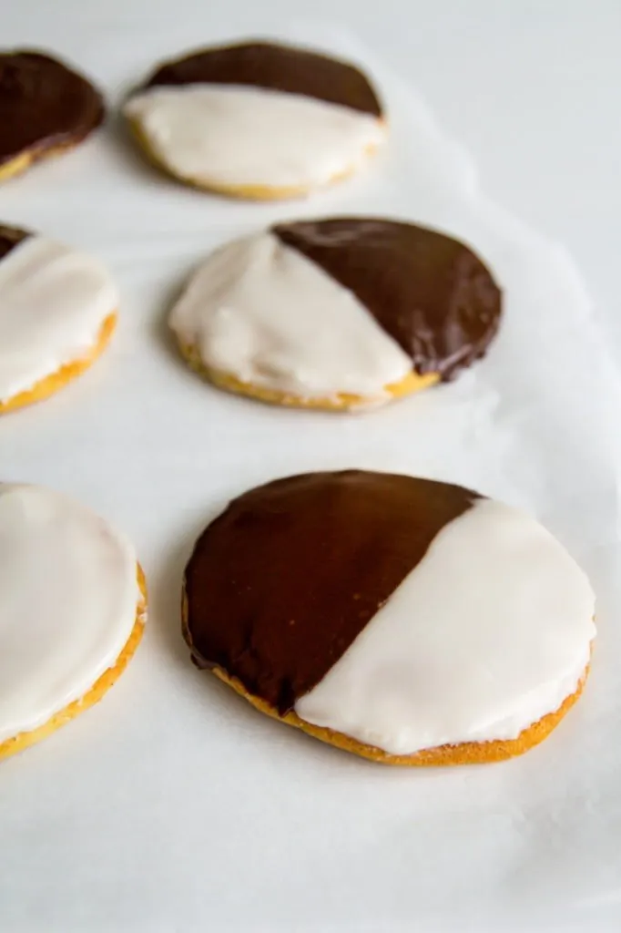 You can make traditional one side black and one side white cookies but can also color the white icing if you’d like. I sometimes mix it up for various holidays and made shades of pink and red for Valentine’s Day, orange and black for Halloween or even green tinted icing for St. Patrick’s day!