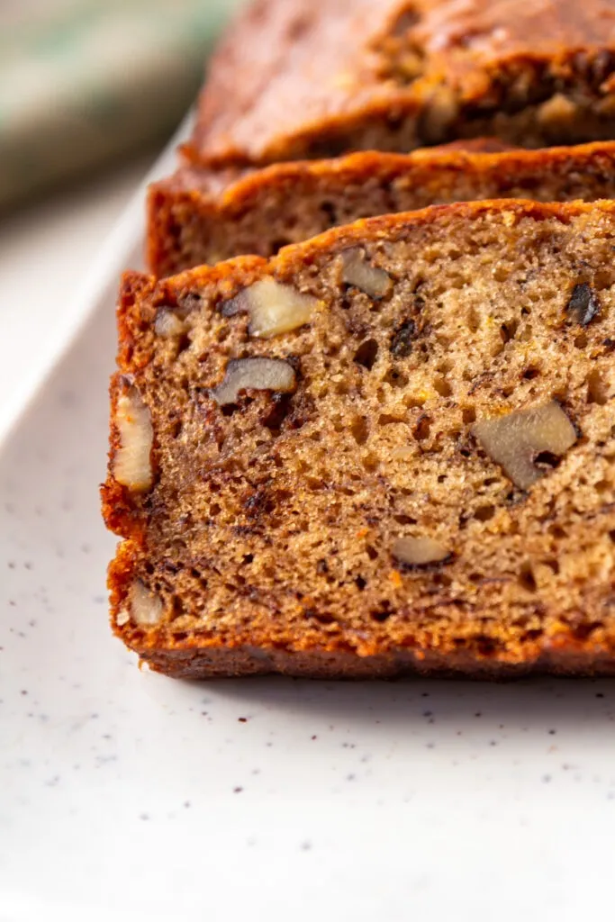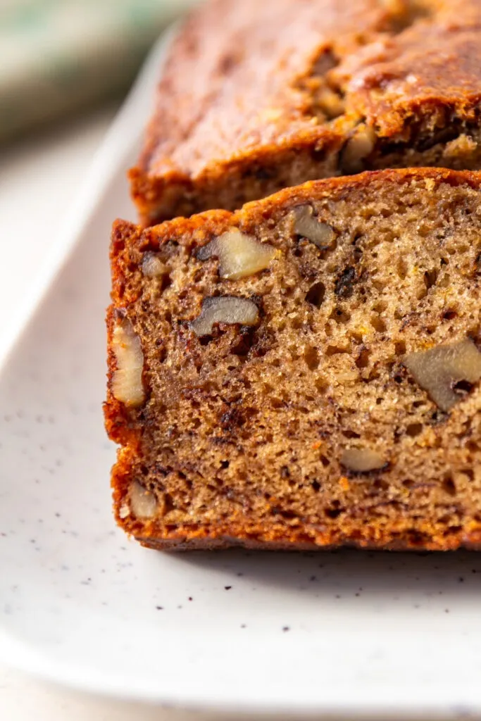 The texture is what makes it. The loaf bakes up firm, sliceable, and tender with a fully set crumb. No gummy middle. No mushy texture. Just a proper quick bread that holds its shape and tastes like banana.
