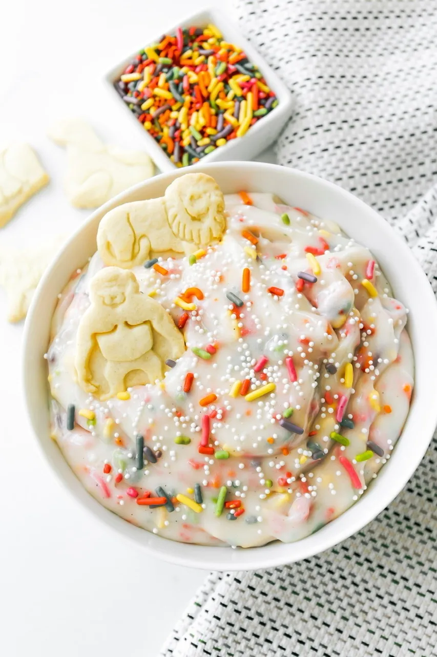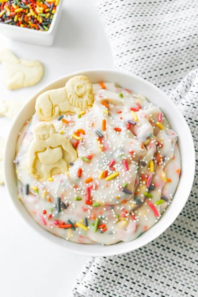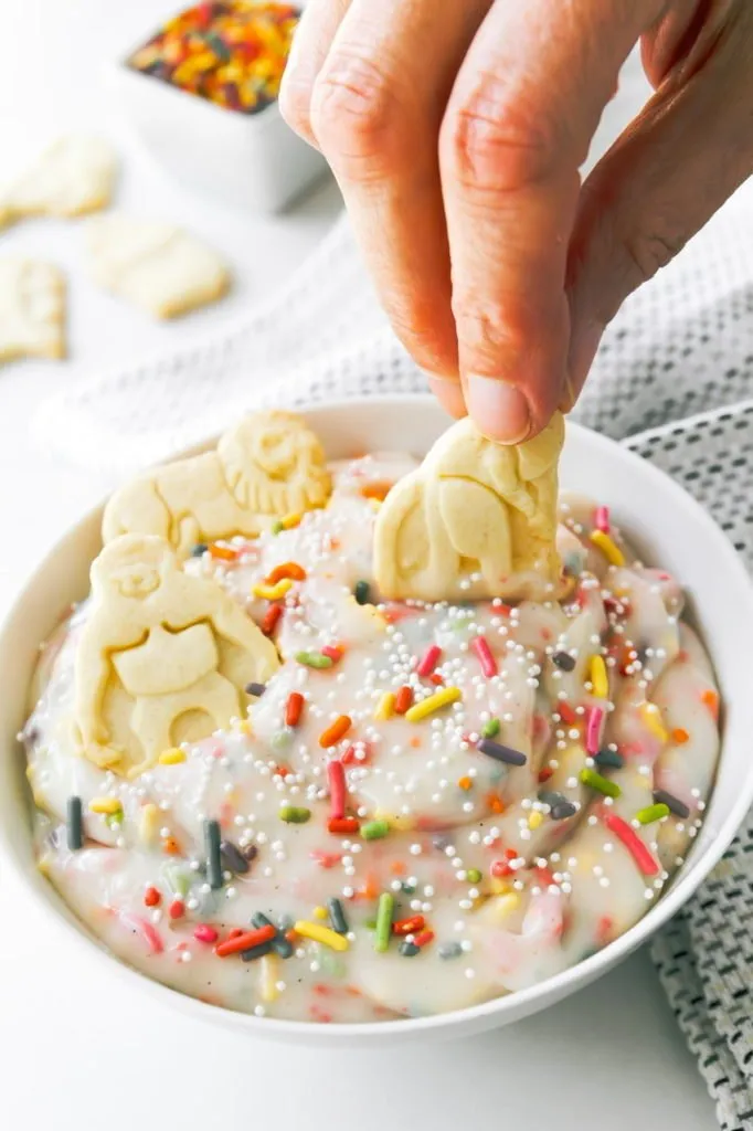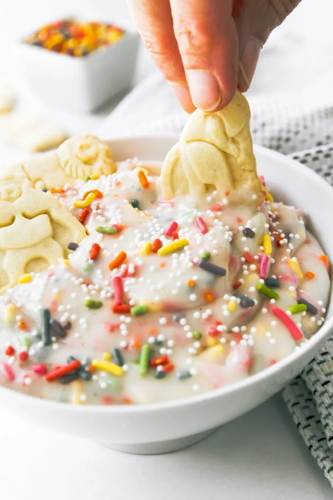 You could make your own homemade animal shaped cookies (actually, the Dunkaroo cookies were round!) but why would you? So many brands to choose from as well as a lot of store brands and they have a specific taste that’s hard to replicate. The icing however is something you can whip up quickly for these and be dunking in no time!