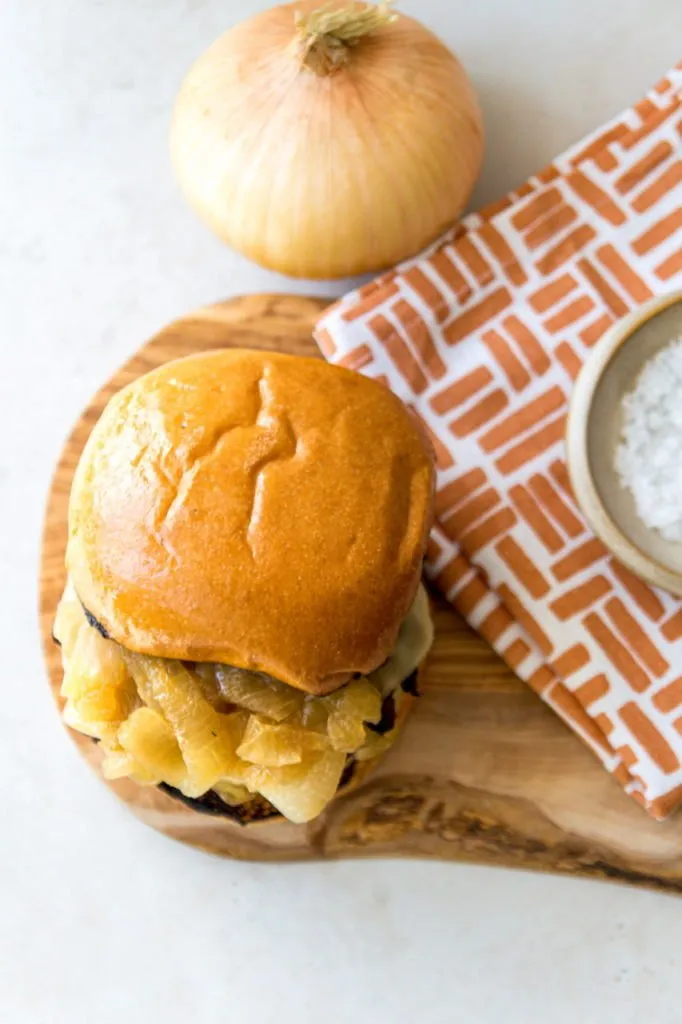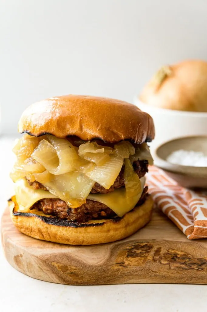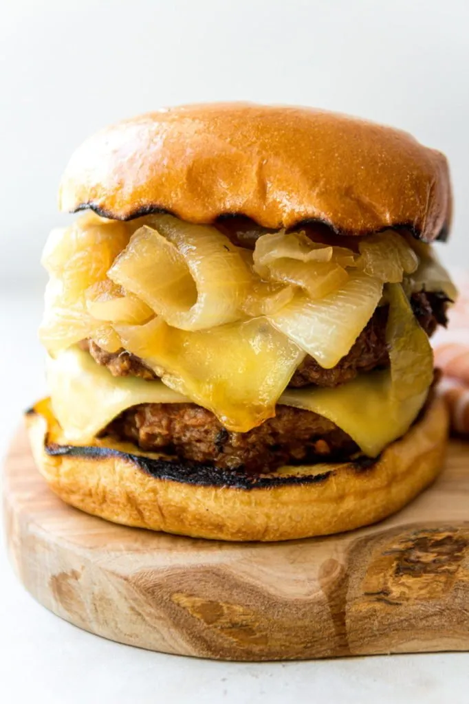 Bonjour! Let’s take a vegan burger, infuse it with onion soup goodness then add savory caramelized onions, lots of melty vegan cheese and place it on a vegan brioche bun shall we? C’est magnifique! (Five years of French and this is about all I remember…) So this burger is basically my popular slider recipe but made into bigger “grand” (more French!) burgers. I’ve also created a quick and easy way to make onions taste like soup. It’s pretty incredible, so let’s get started!