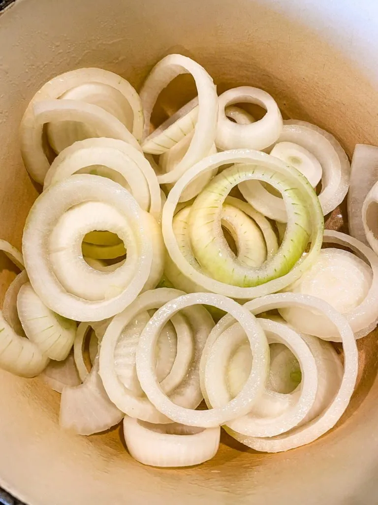 For the onions, you’re going to sauté sliced onions in vegan butter then add a little sugar, some booze (it’s what makes it French!) then some soy sauce. It really makes them taste like onion soup! I like using yellow onions but sweet onions or red ones will also work.