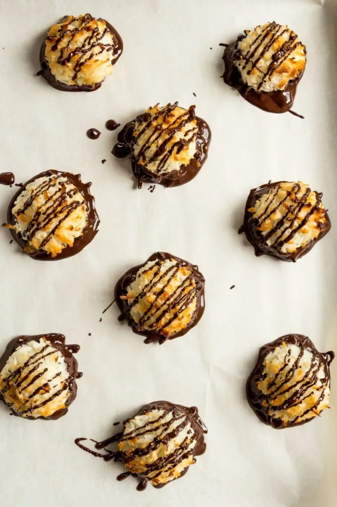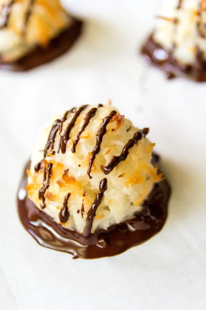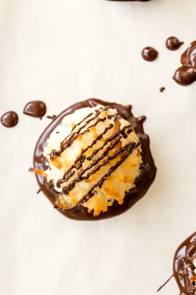After baking, you’re going to let the macaroons cool then dip each one into chocolate then drizzle some more on top. Yum. It’s pretty simple to do. I just gently dipped each macaroon into the melted chocolate just to cover the bottoms of each one. You could also lift them in and out of the chocolate using a fork. If you’re feeling lazy, you could just add some chocolate chips into the coconut mixture before baking or just leave chocolate out all together, but why would you?!