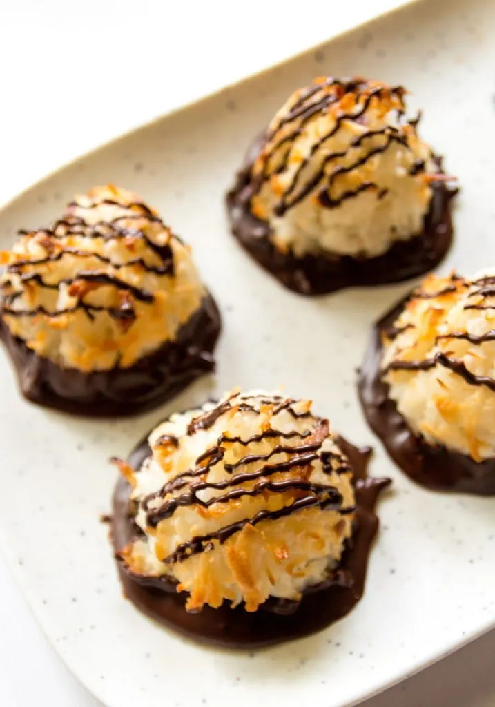 Make sure to let the macaroons cool completely before dipping into chocolate and if you’re in a hurry, you can pop them into the fridge to cool. After dipping, placing in the fridge again will help the chocolate set faster but fair warning, it might look duller when chilled. If you don’t temper chocolate, this happens. Use a good bittersweet chocolate for these. The macaroons are so sweet that a darker less sweet chocolate is a better match than a semisweet chocolate. I hope you enjoy these!