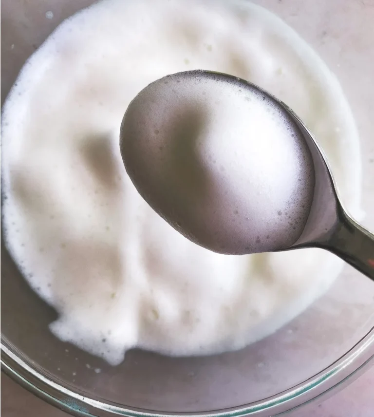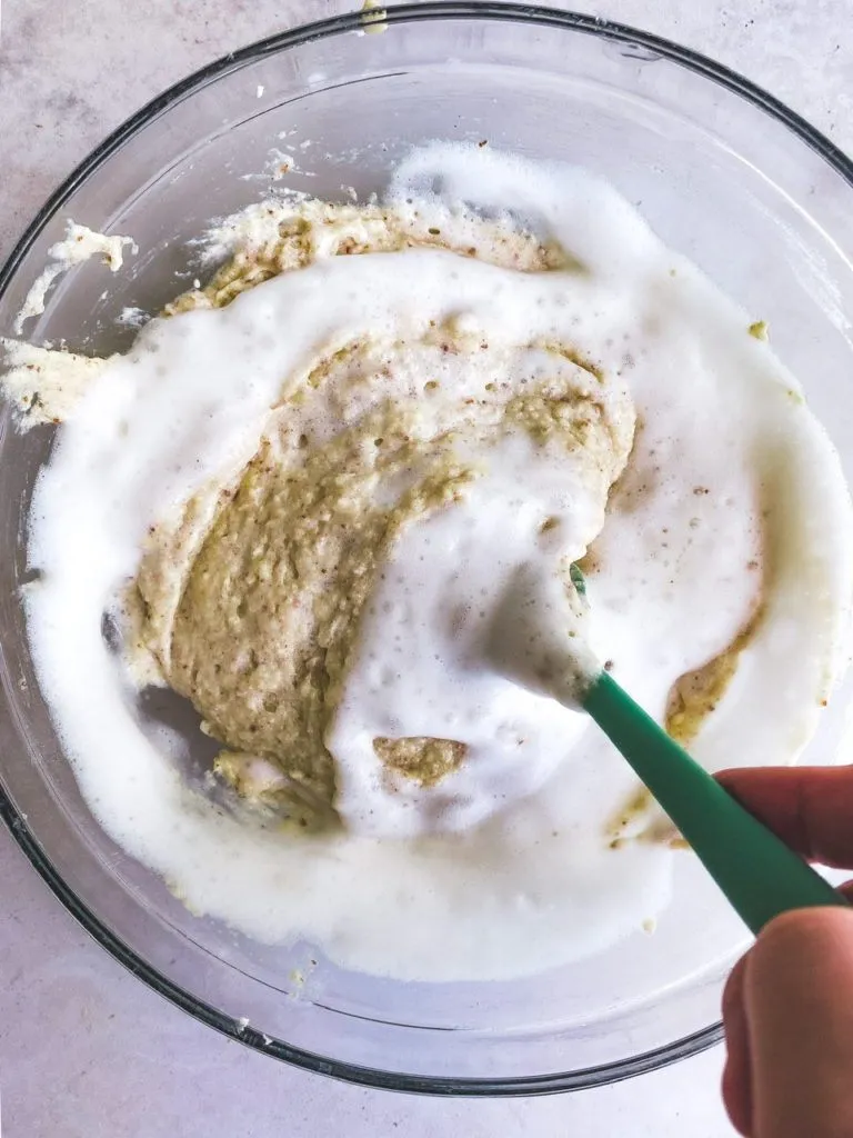 A crucial step for this recipe is folding in the beaten aquafaba “egg whites”. You need to start with room temperature aquafaba as it will whip and hold air more easily. I used a hand mixer but a stand mixer or whisking by hand will also work. You only need soft not stiff peaks (like for a meringue) so it doesn’t take much but it does need to be whipped well. Folding in the whites to the base mixture is also very important. Folding just means you gently combine the whites into the rest of the mixture. I use the classic French technique of sinking a rubber spatula into the center of the bowl then you twist the bowl a quarter turn with your other hand while swiping the spatula underneath the batter and folding it over the top of the whites on top to incorporate it. You continue to do this gently until the whites are fully combined with no streaks of white left.
