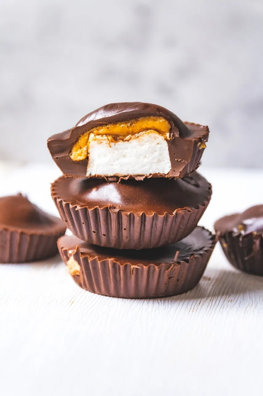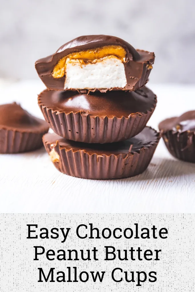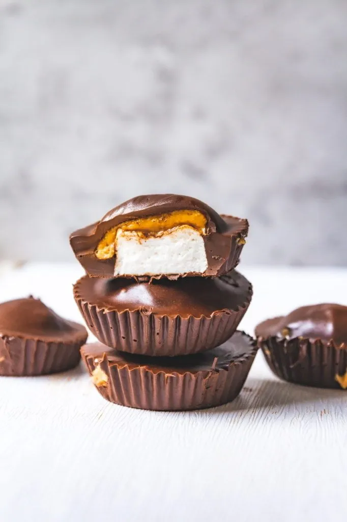 I am well aware that this is less a recipe than assembly of some of my favorite ingredients. It’s an easy homemade candy you can make when the mood strikes as it does often for me! This is basically a peanut butter cup with a squidgy vegan marshmallow tucked inside and it instantly takes me back to those Mallo Cups I enjoyed as a kid but with a luscious blob of peanut butter added!