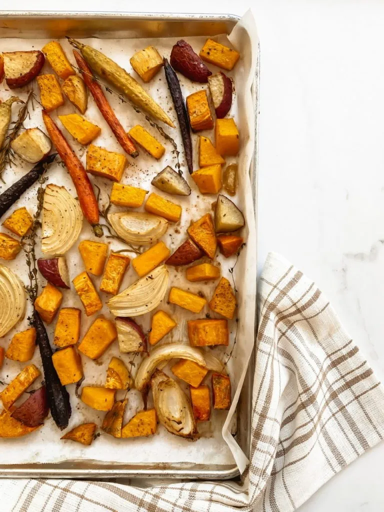 Root veggies and squashes are usually the best veggies to roast. I always use onions in my mix so don’t skip those. You could use a combination of your favorites but I like butternut squash, potatoes, carrots and sweet potatoes as a basic mix.