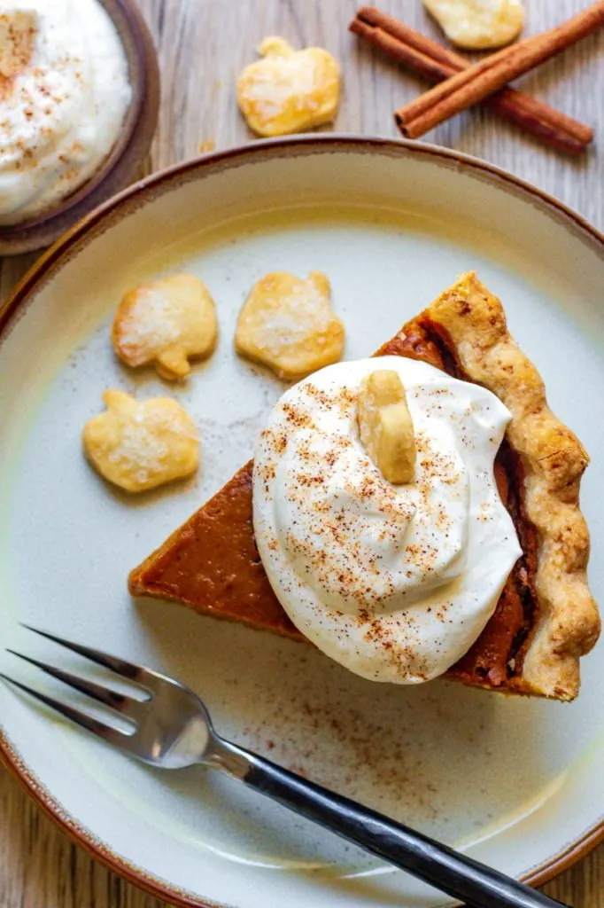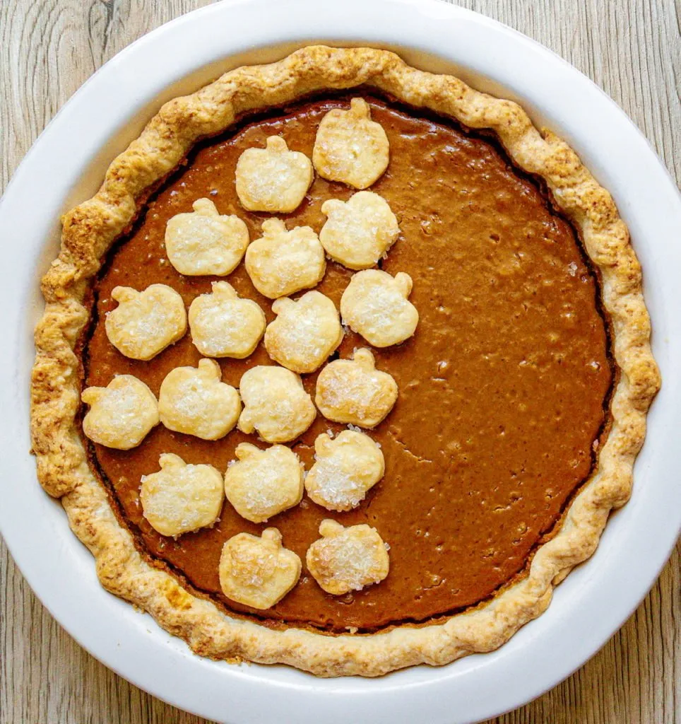 I decorated the top of my pie with festive cutout pastry pumpkins (say that 10X fast!) as the recipe I used (linked above) was for a double crust. You can use leaves or other festive fall shapes which can be bought at a lot of crafting stores or online. I baked these separately after brushing with vegan cream and sprinkling sanding sugar on top. I baked them at 350° for 10 minutes until they just started to brown. It’s a nice touch for a holiday gathering (and covers any cracks in the pie!) and everyone will ask how you did it! We got addicted to these little pastry pumpkins and couldn’t stop eating them. They’re so good!