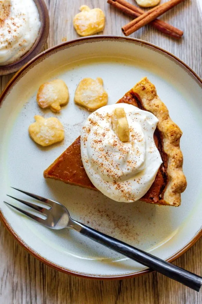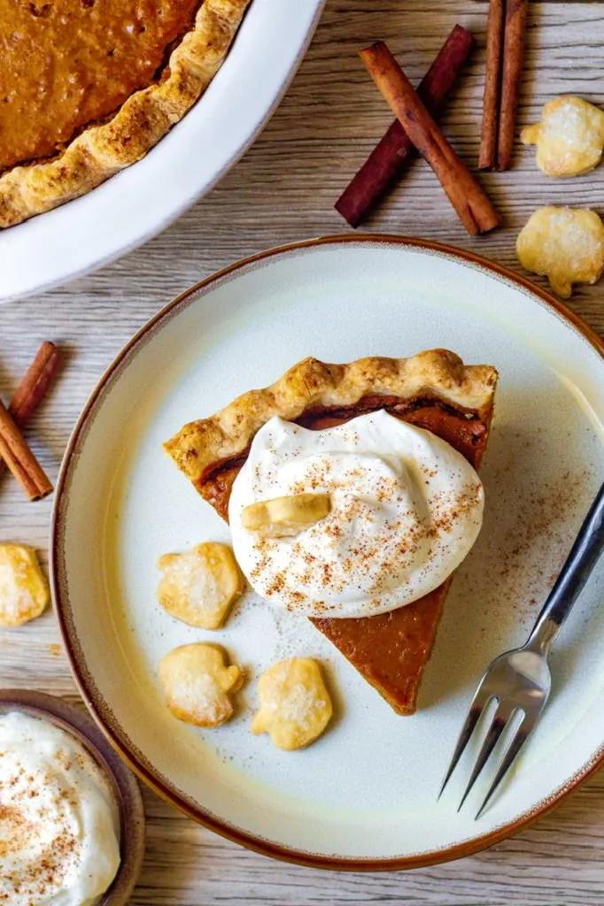 • I don’t recommend freezing the entire pie to serve later as ice crystals could form due to the high water content in canned pumpkin but if you need to, cool completely, wrap tightly, then thaw in the fridge for at least 12 hours before serving to avoid a soggy crust. If you freeze smaller pieces, just make sure there’s no whipped topping on them.