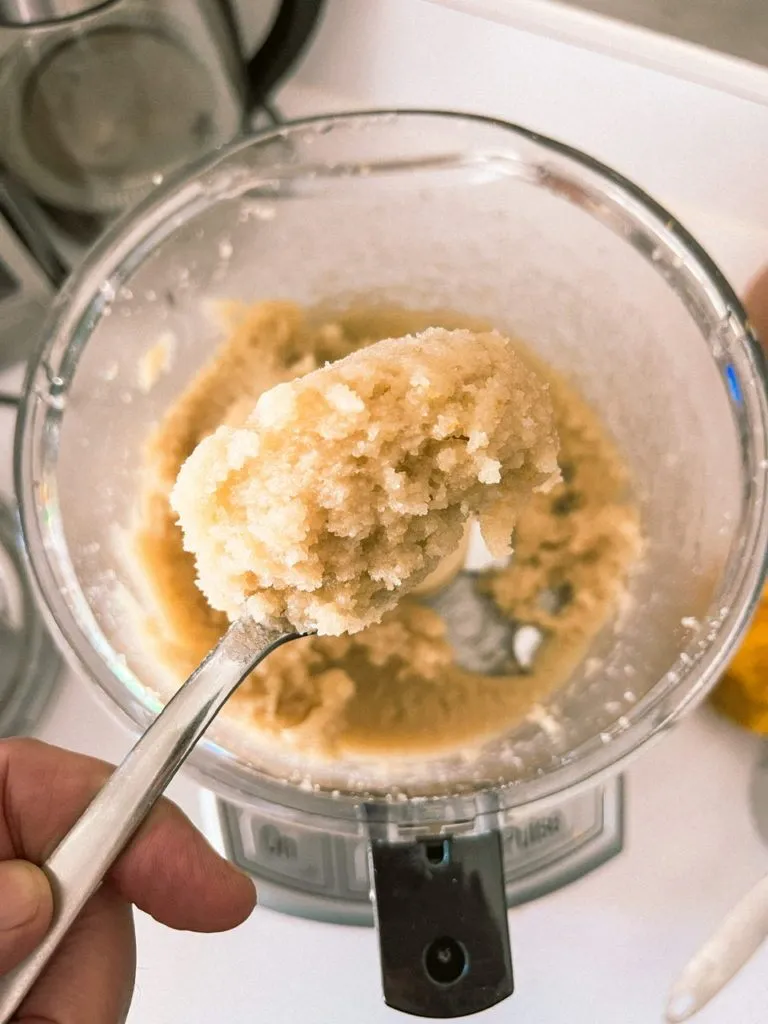 The consistency of the dough before baking should be that of a thick paste. Most recipes don’t call for any flour as the egg whites are enough to bind everything but since we’re making these vegan and to keep with the almond theme, I’m using some almond flour. This also keeps the recipe gluten-free friendly.