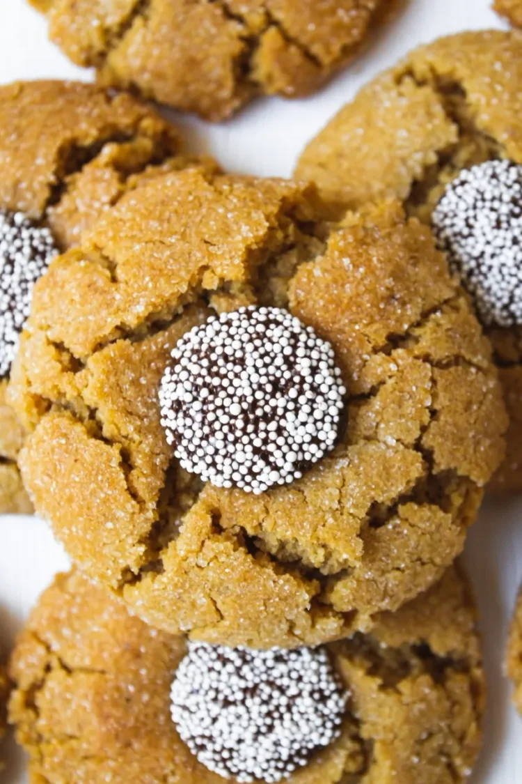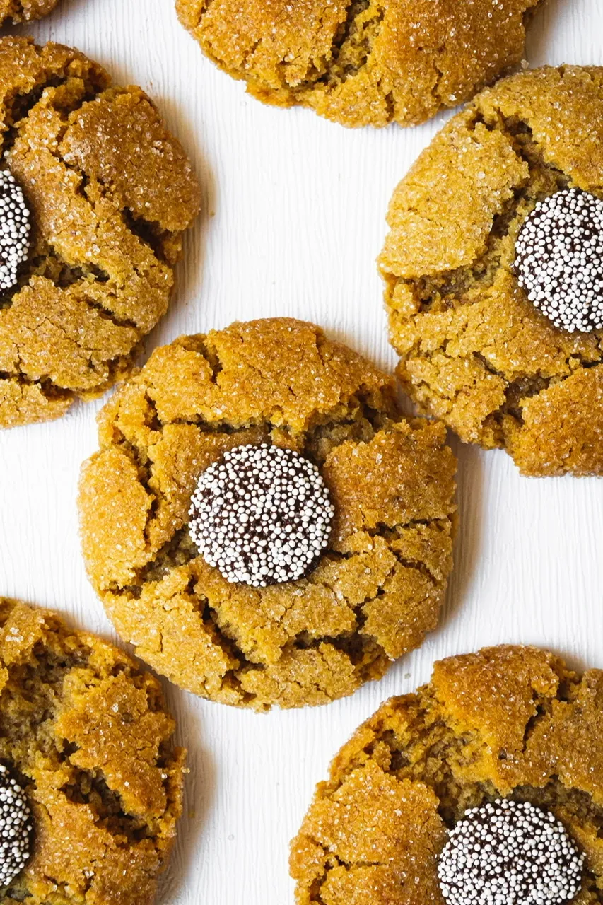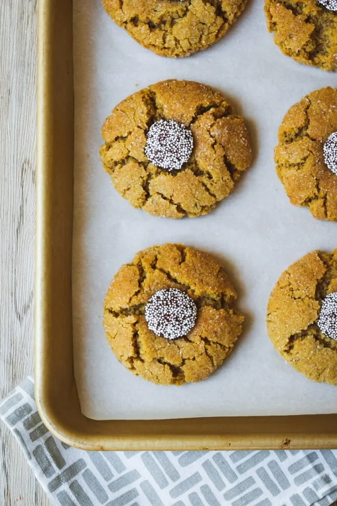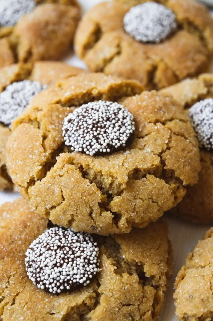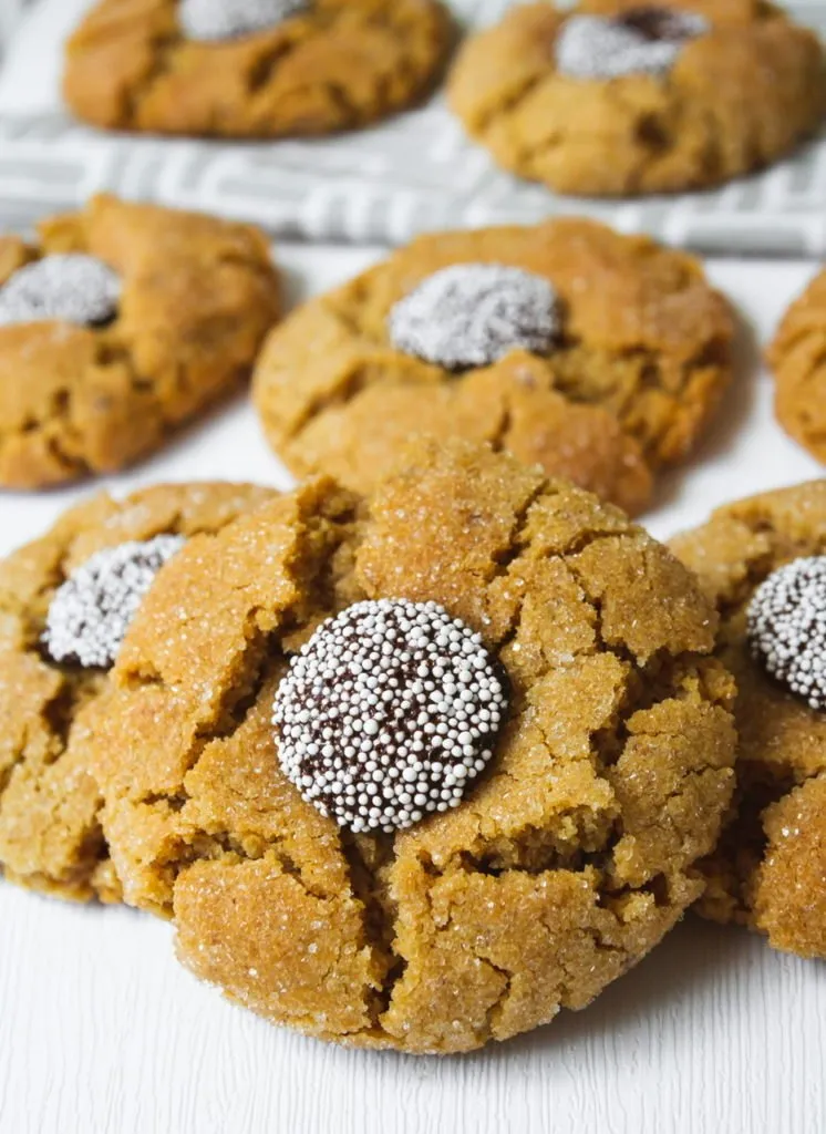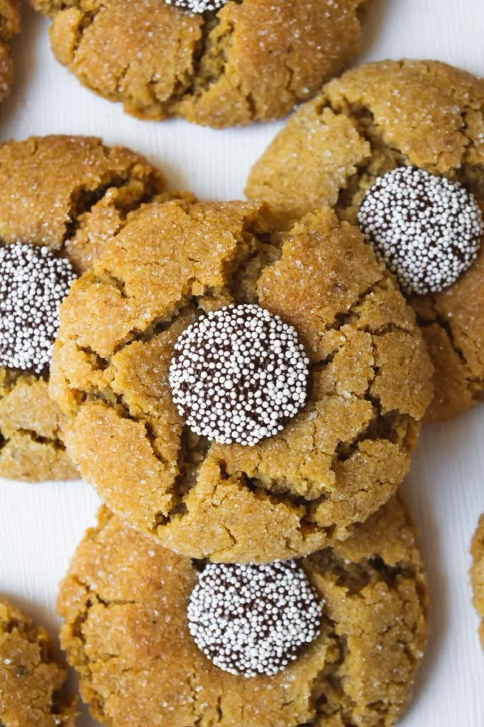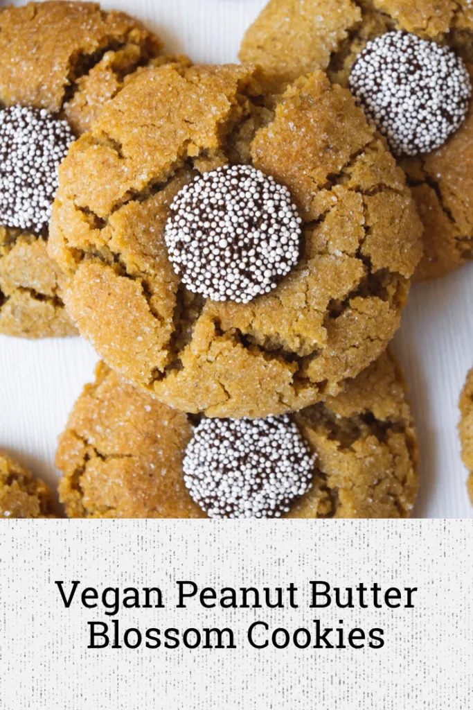 I have a lot of peanut butter cookie recipes on my blog, but I think these peanut butter blossom cookies might just be my favorite. Chocolate, PB and me have been engaged in a lifelong love affair and I’m always looking for ways to create more variations on the theme. These are a popular cookie made usually with a Hershey’s kiss as the chocolate element, but they’re not vegan of course so we’re using a chocolate disc made even more festive by the addition of some non-pareil sprinkles. To me, these look even more like the center of a daisy or flower giving realness to the name blossom!