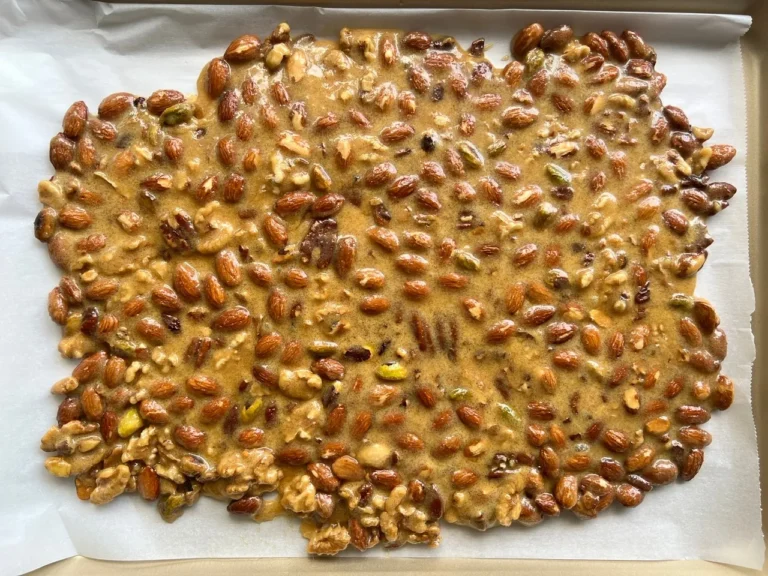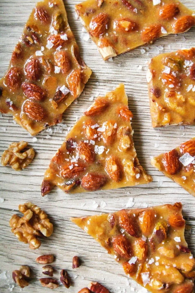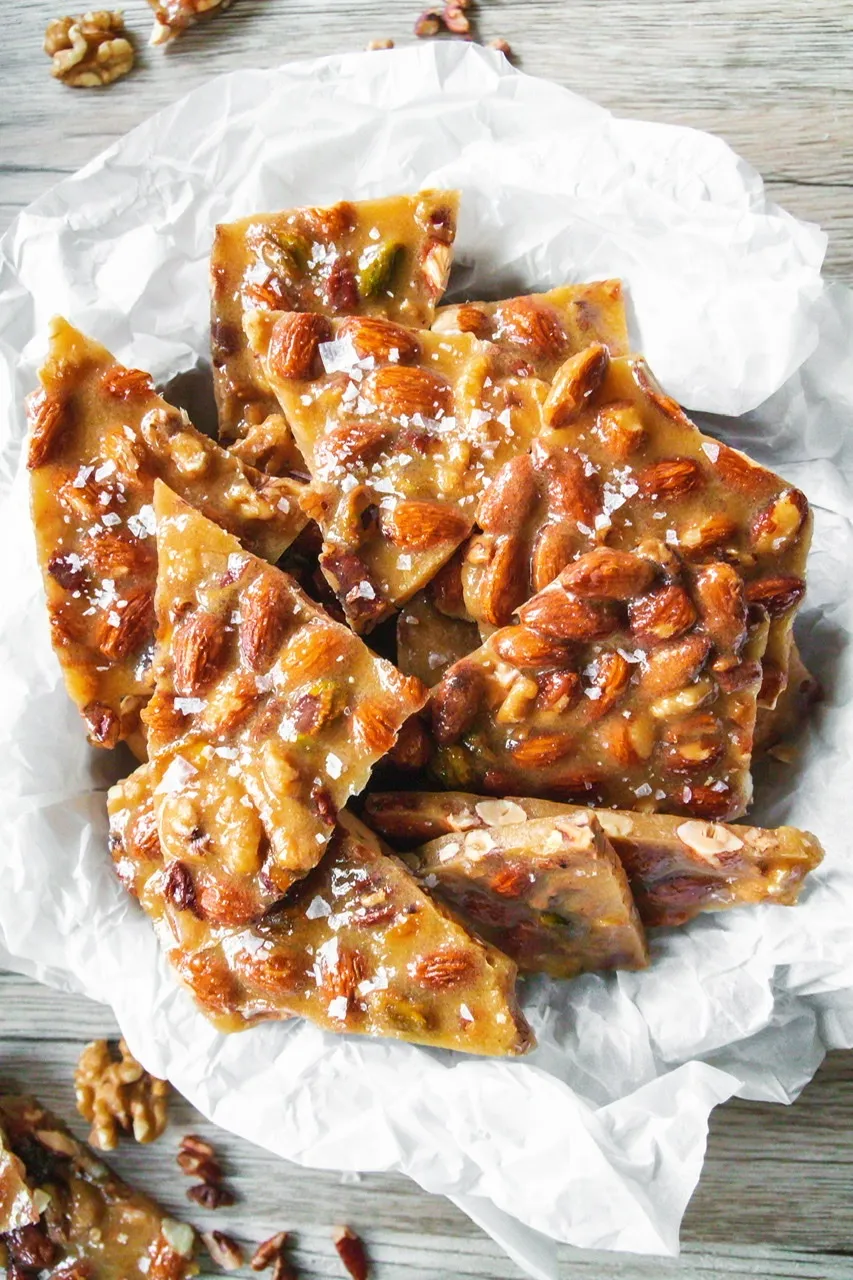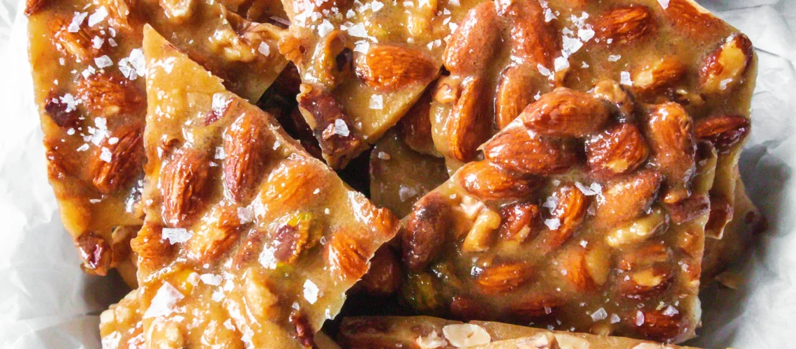I’ve been making this nut brittle for over 20 years probably. The recipe is a standard one that’s most likely in every church cookbook and this one isn’t any different other than it can be made entirely in the microwave so there’s no fussing with a candy thermometer. I found the method through the now defunct Everyday Food mini magazine and it’s now one of my holiday favorites. It’s crunchy (yet not break a filling crunchy) and melts in your mouth and the nutty flavor can’t be beat. You could really make this any time of year with any kind of nuts. Peanuts would be a great option but I use a combo of almonds, walnuts, pecans, cashews and pistachios. I would imagine hazelnuts would be amazing in this as well.
