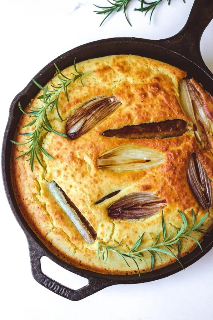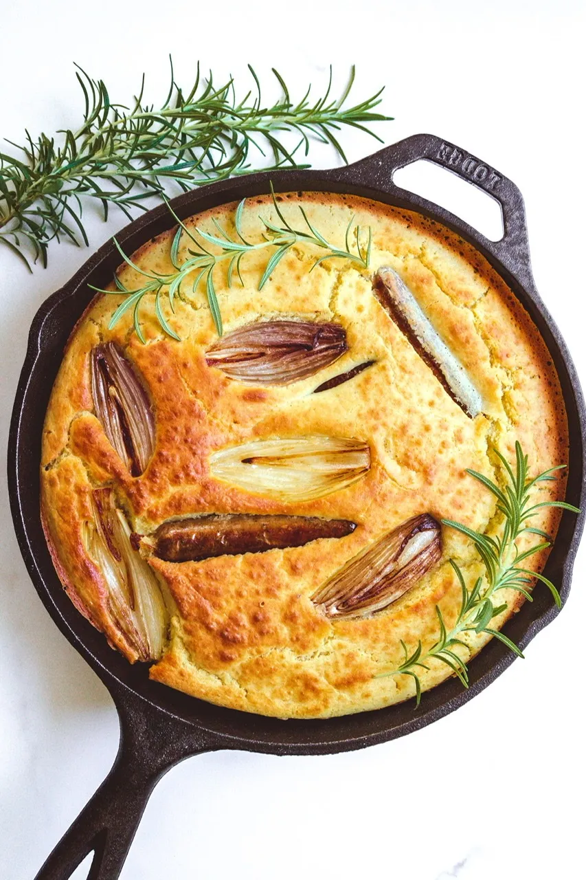 I made this in a cast iron skillet which retains heat really well. After sautéing the sausages and shallots and while the pan is piping hot, you pour the batter in then bake immediately. The mixture puffs up somewhat and although it doesn’t puff exactly how I remember Yorkshire puddings did, it’s still quite tasty.