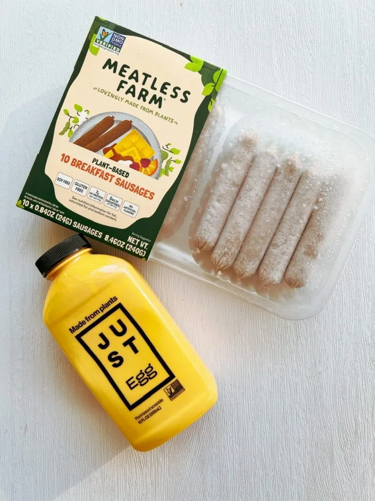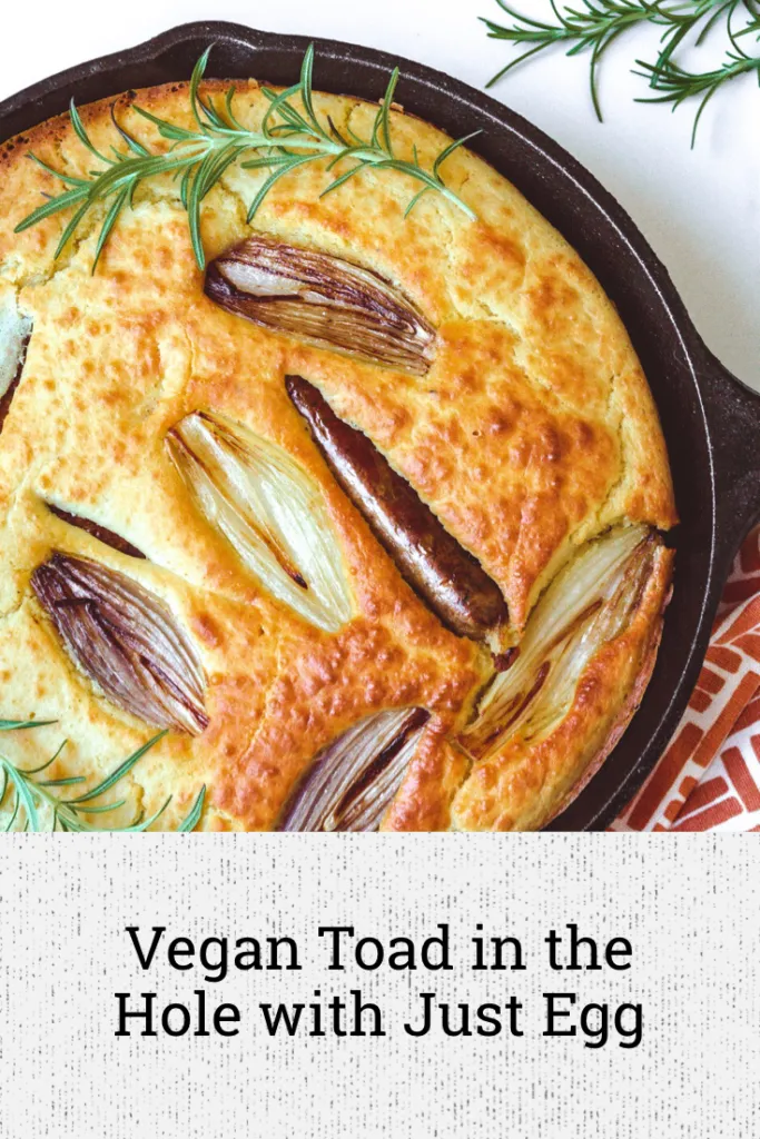 I’ve been eating “toad in the hole” since I was young even though I’m American and this is a British recipe. I’m not sure how my mom stumbled upon it but she made it a lot growing up. I think it must have been in one of her recipe books or she saw it in a magazine. Regardless, it’s basically a Yorkshire pudding which is an eggy pancake like batter that covers breakfast sausage links. We’re making it vegan of course by using vegan Just Egg, all purpose baking mix and vegan sausages!